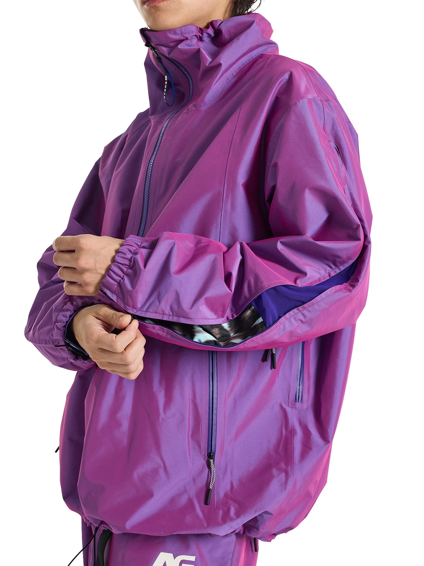 The Burton AG Offspin Jacket ups the ante with iridescent material that shifts colors as you move. A loose fit lends them a relaxed feel with the clean look of a tall collar without a hood. Waterproof, breathable 2L construction offers coverage for wet weather with the rider-designed features you expect in a snowboard jacket.