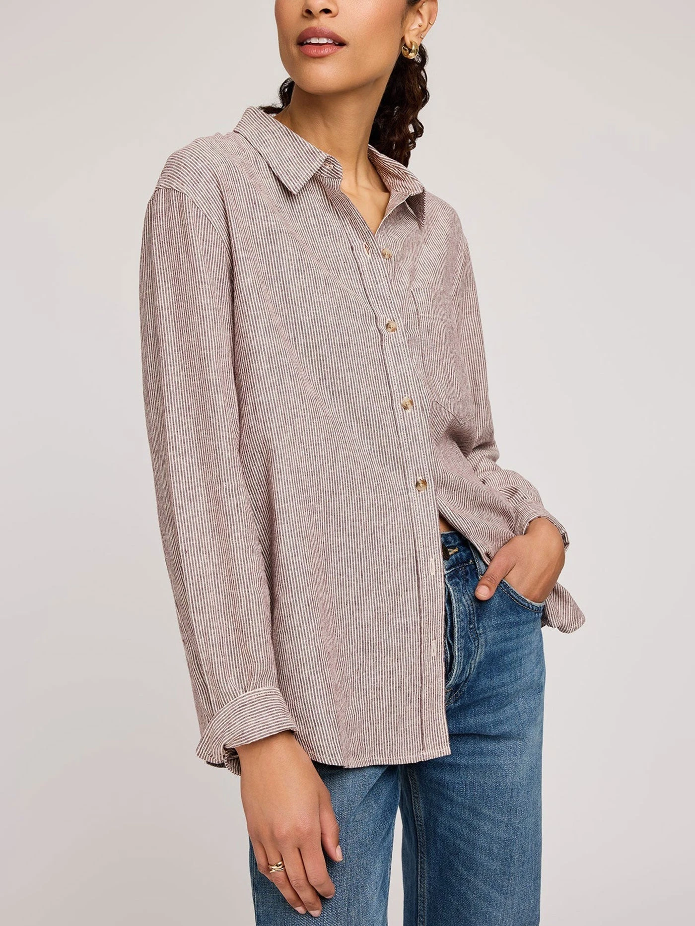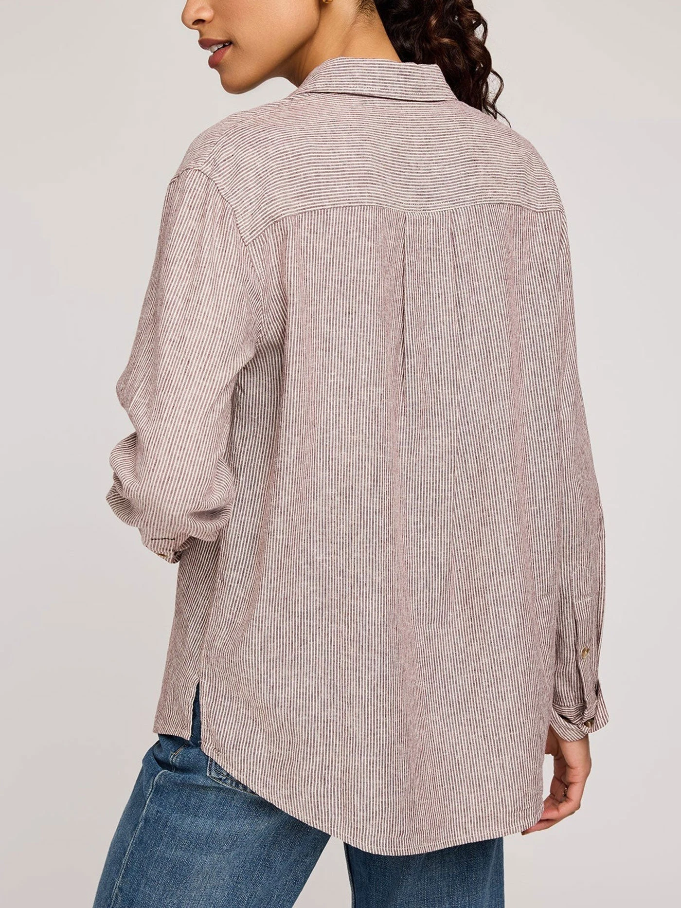 The Arabella summary down shirt is made of a linen blend fabric in a yarn-dyed stripe. Features include a patch pocket and side slits. Wear it summaryed up or worn open as a light layering piece.