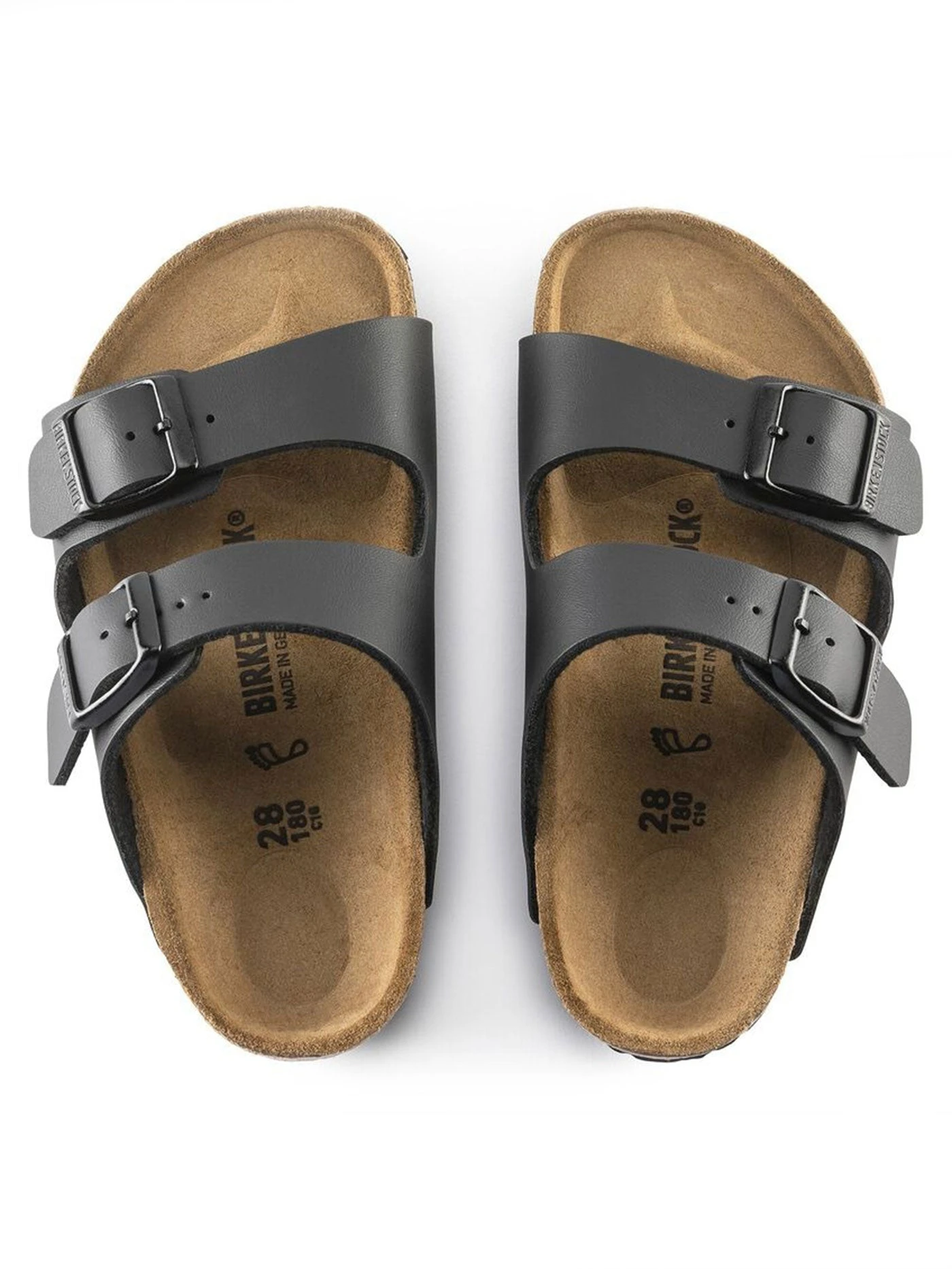 The all-time icon, sized down just for kids. Durable and easy to clean, Birko-Flor® gives the two-strap look a classic, leather-like finish. Complete with classic BIRKENSTOCK design elements, like adjustable buckles and a contoured cork-latex footbed to keep little feet comfortably on the move.