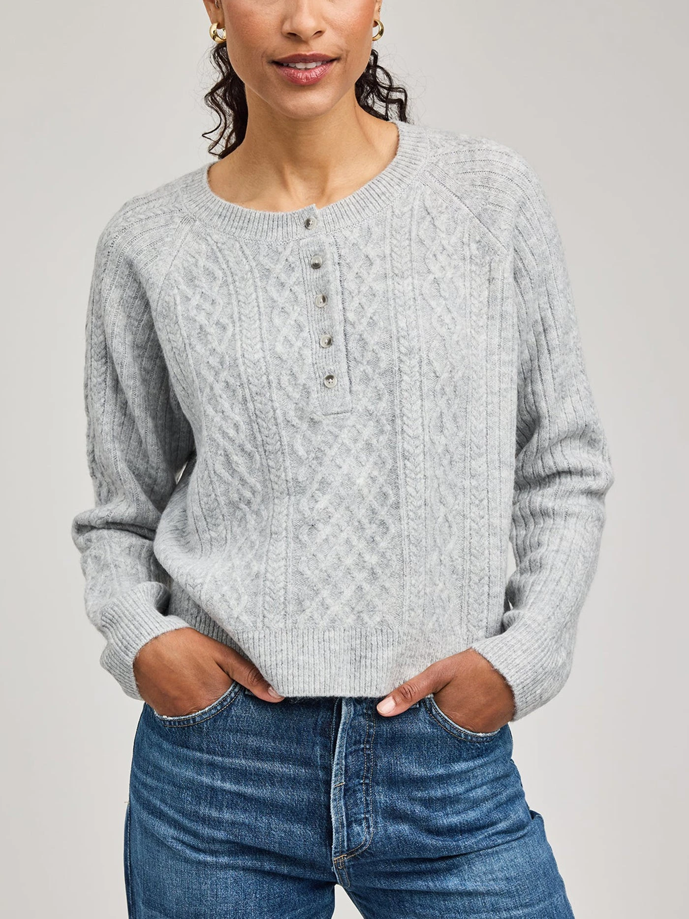 The Aspen sweater is made of a cozy yarn with a cable knit pattern throughout. Features include raglan sleeves and a half placket with summarys.