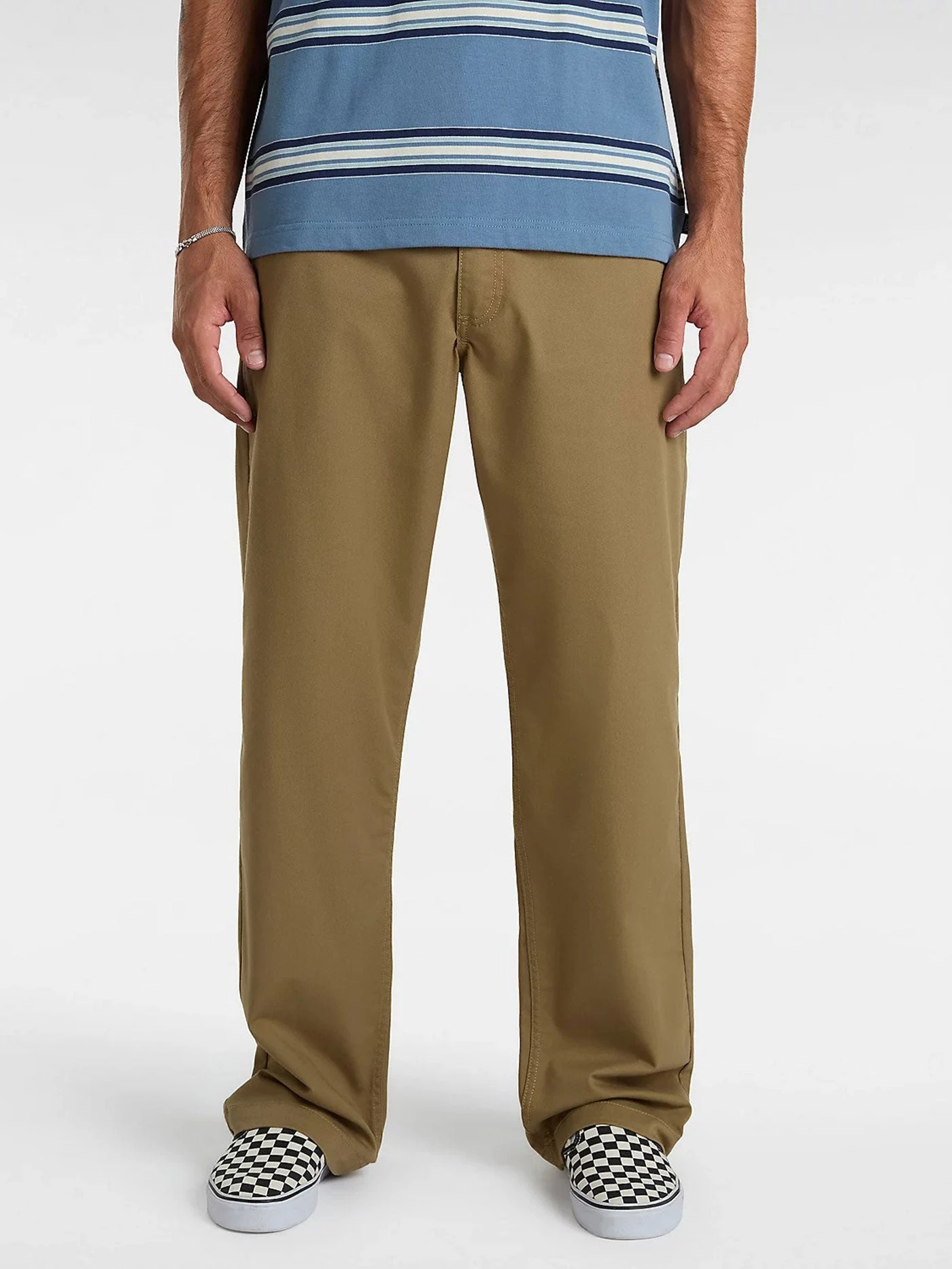 A versatile chino pant that delivers style and functionality, the Authentic Chino Loose Trousers let you stop worrying about your gear and focus on your skating. These loose fit chino pants feature a plethora of pockets to stash your stuff and embroidered ‘Drop V’ bartacks for reinforcement with a heritage twist. There’s also checkerboard twill taping on the internal fly and our flag label sewn into the hem for added branding when the legs are cuffed.