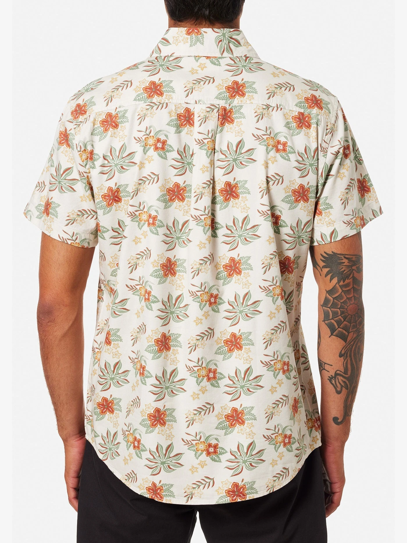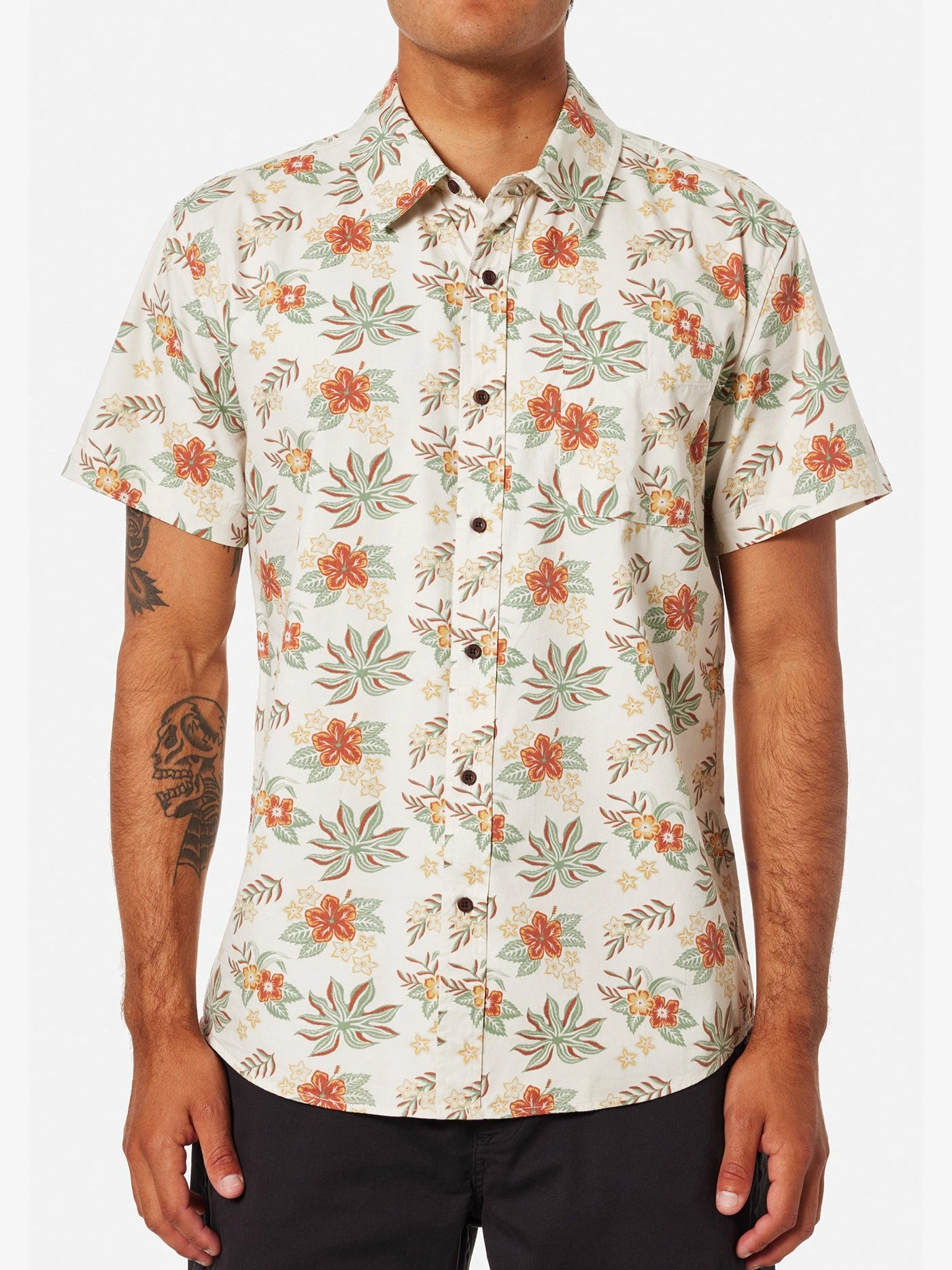 The Benji Shirt features a custom floral pattern inspired by the islands on a cotton blend fabric, perfect for any occasion.Â