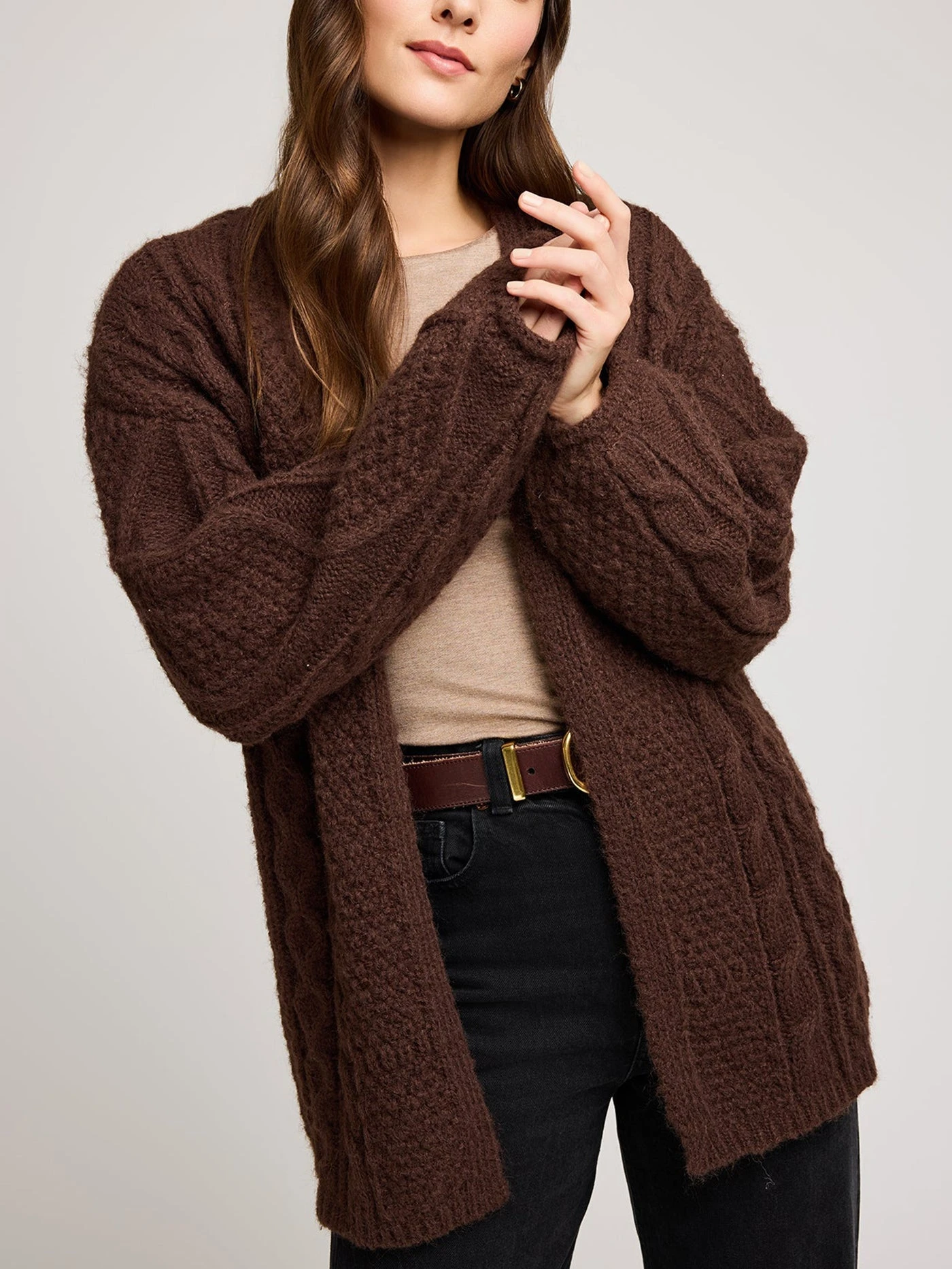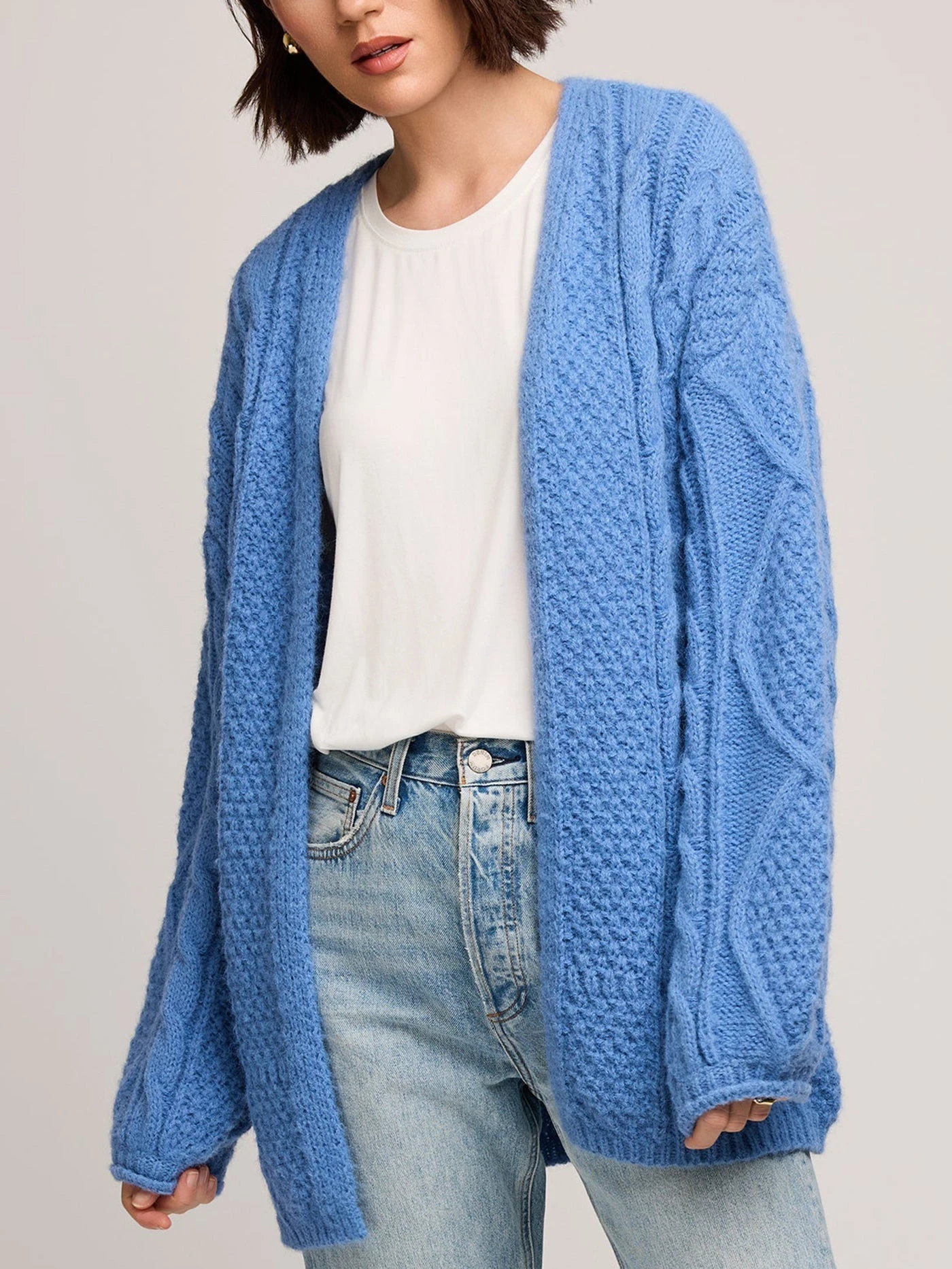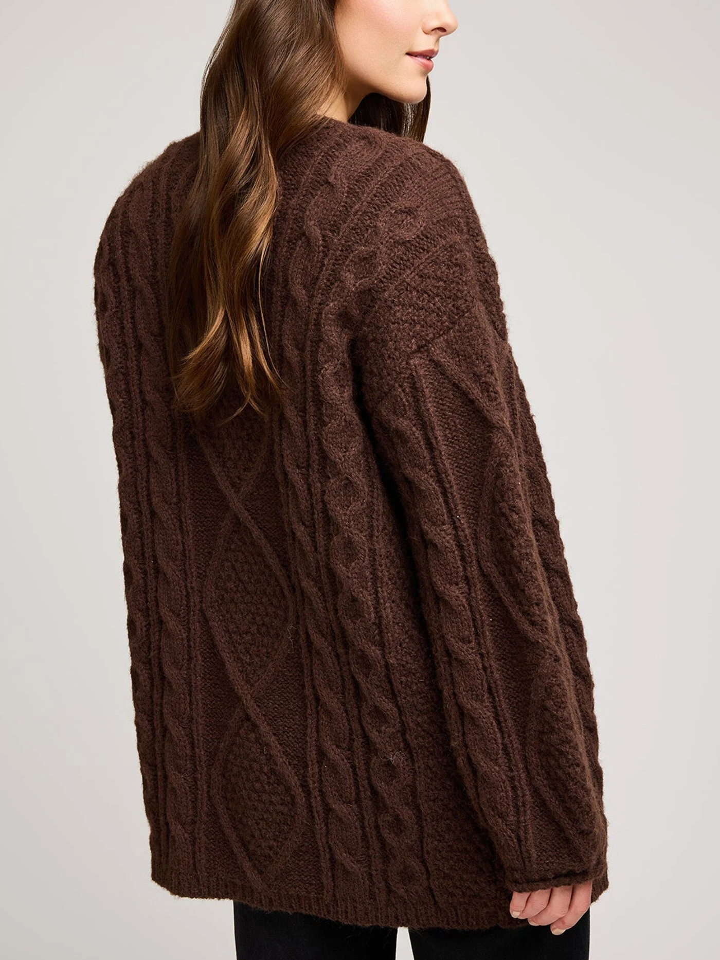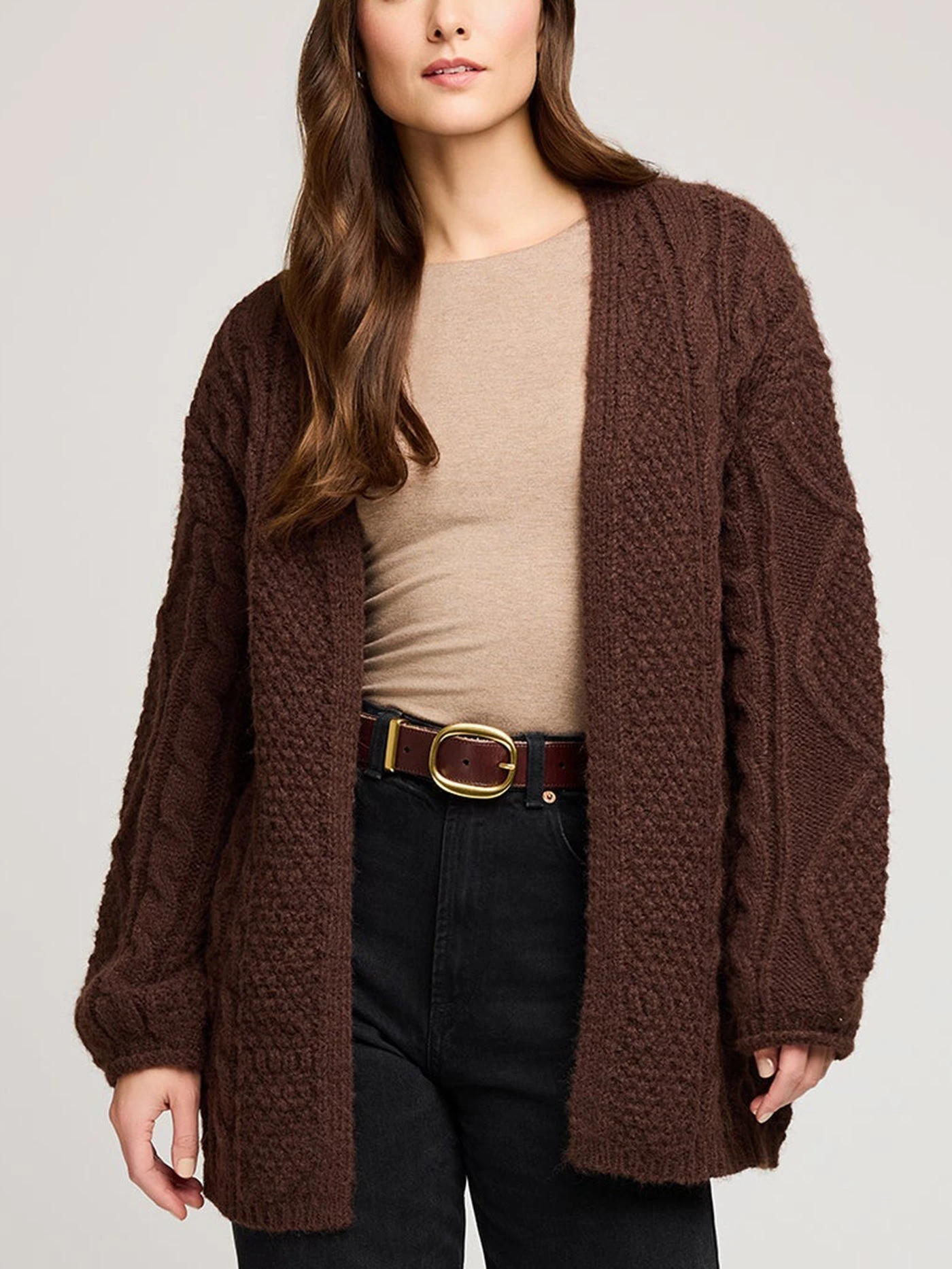 The Betty cardigan is made of a fuzzy yarn with a lofty feel. Features include various cable knit stitch patterns and a rolled sleeve hem detail.