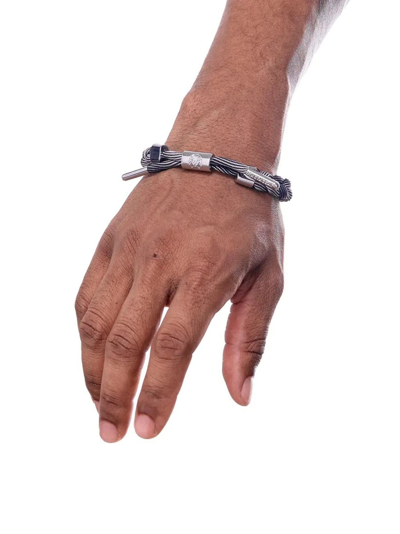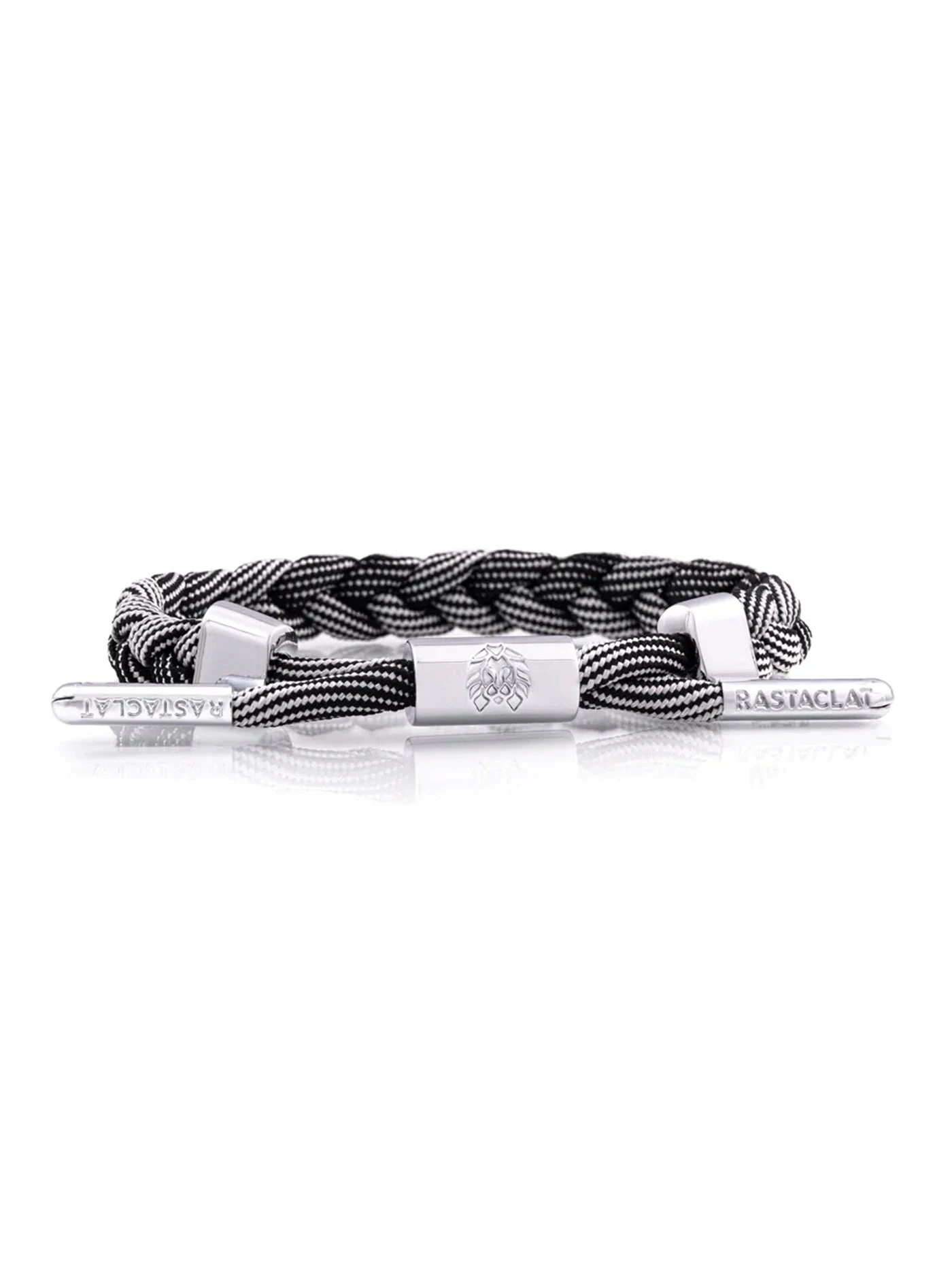 HAND-CRAFTED, CLASSIC RASTACLAT BRAIDED BRACELET FEATURING A TWO-TONE POLYESTER NYLON LACE AND HIGH-POLISH CHROMIUM MIRROR FINISHED HARDWARE WITH NO FILL FOR A TONAL LOOK.