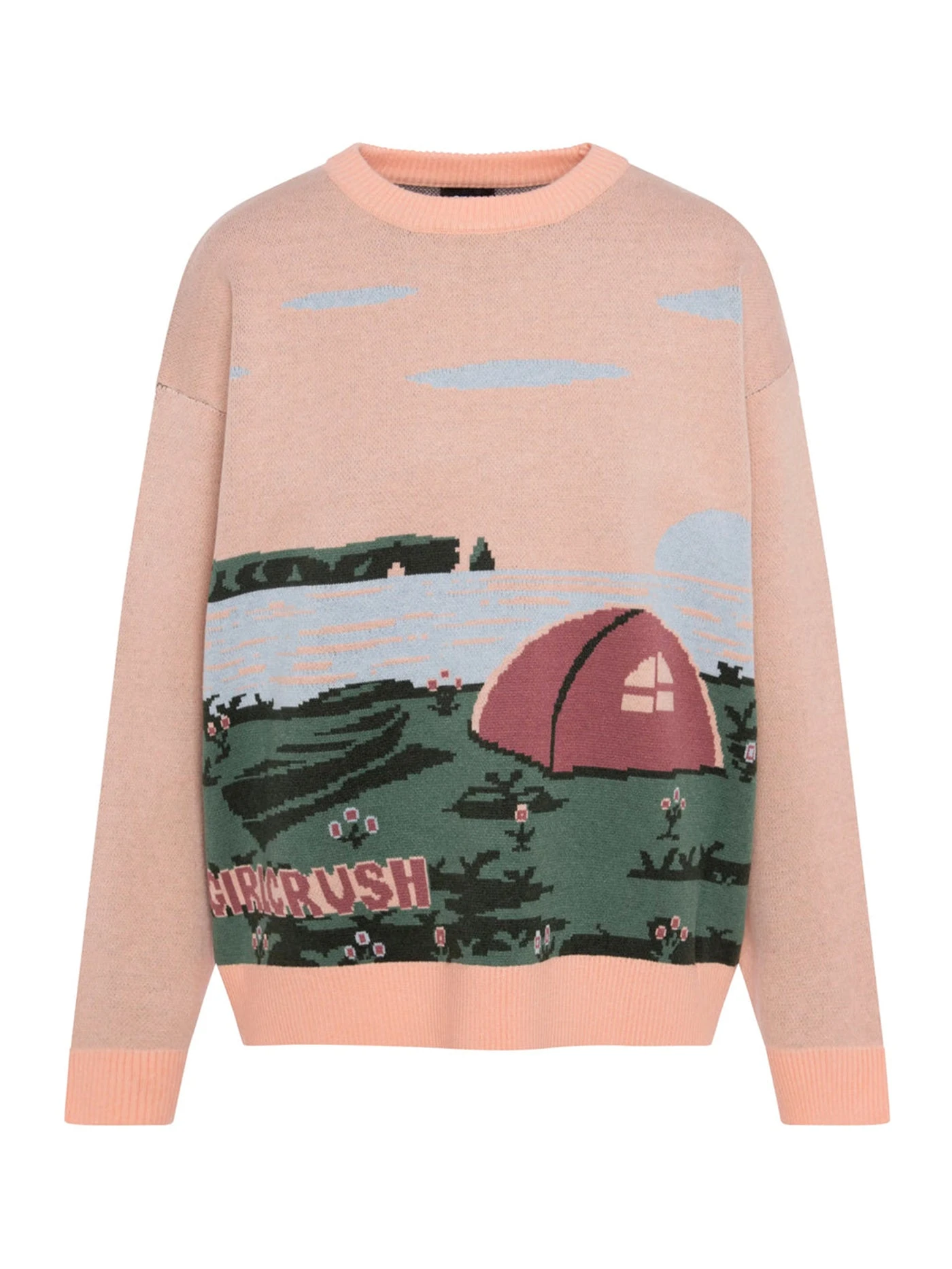 The “Camping in Gaspé” sweater captures the magical moment of a sunset over one of Québec’s most iconic landscapes: the Percé Rock. Its illustration brings back memories of tent nights with eyelashes full of stars. A slightly oversized fit and ultra-soft knit let you carry a piece of Gaspésie with you.