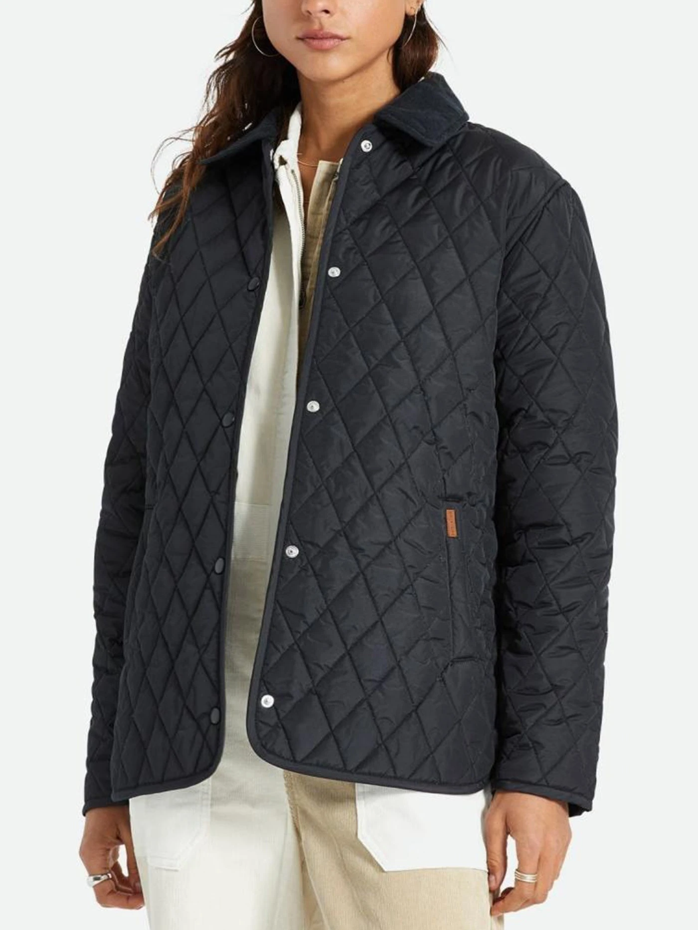 With a nod to men’s military style, the Cass Jacket has a standard silhouette with room to layer. Warm diamond quilting is contrasted by a relaxed corduroy neck collar. Complete with welt pockets and an easy-snap front.