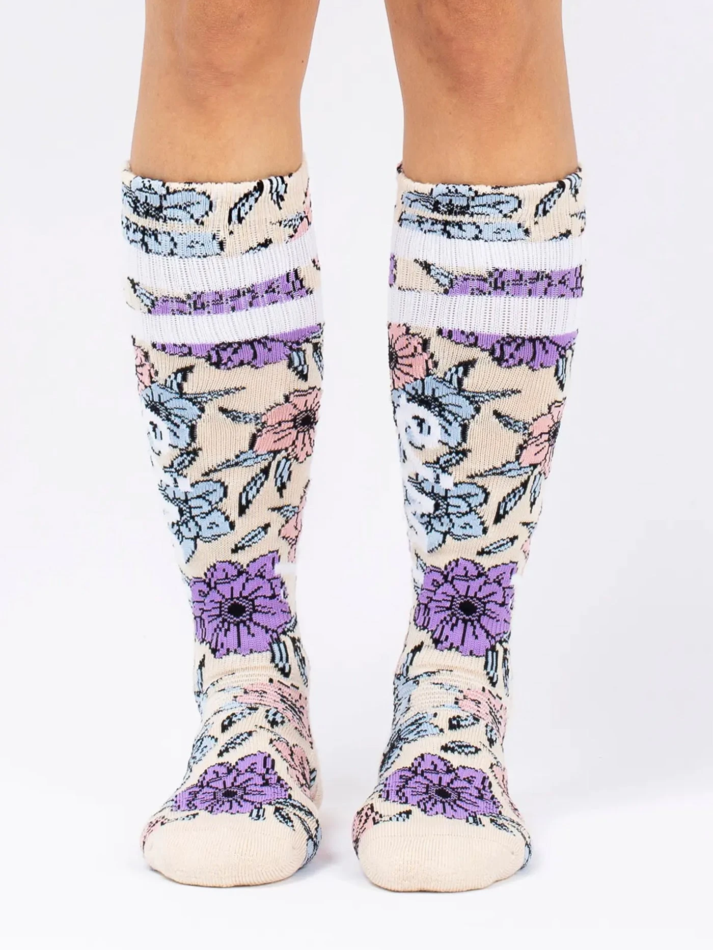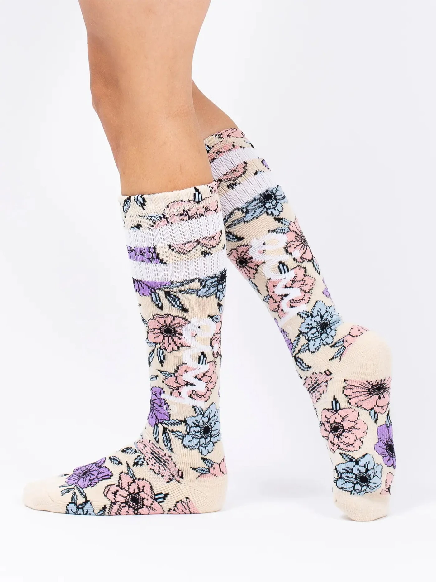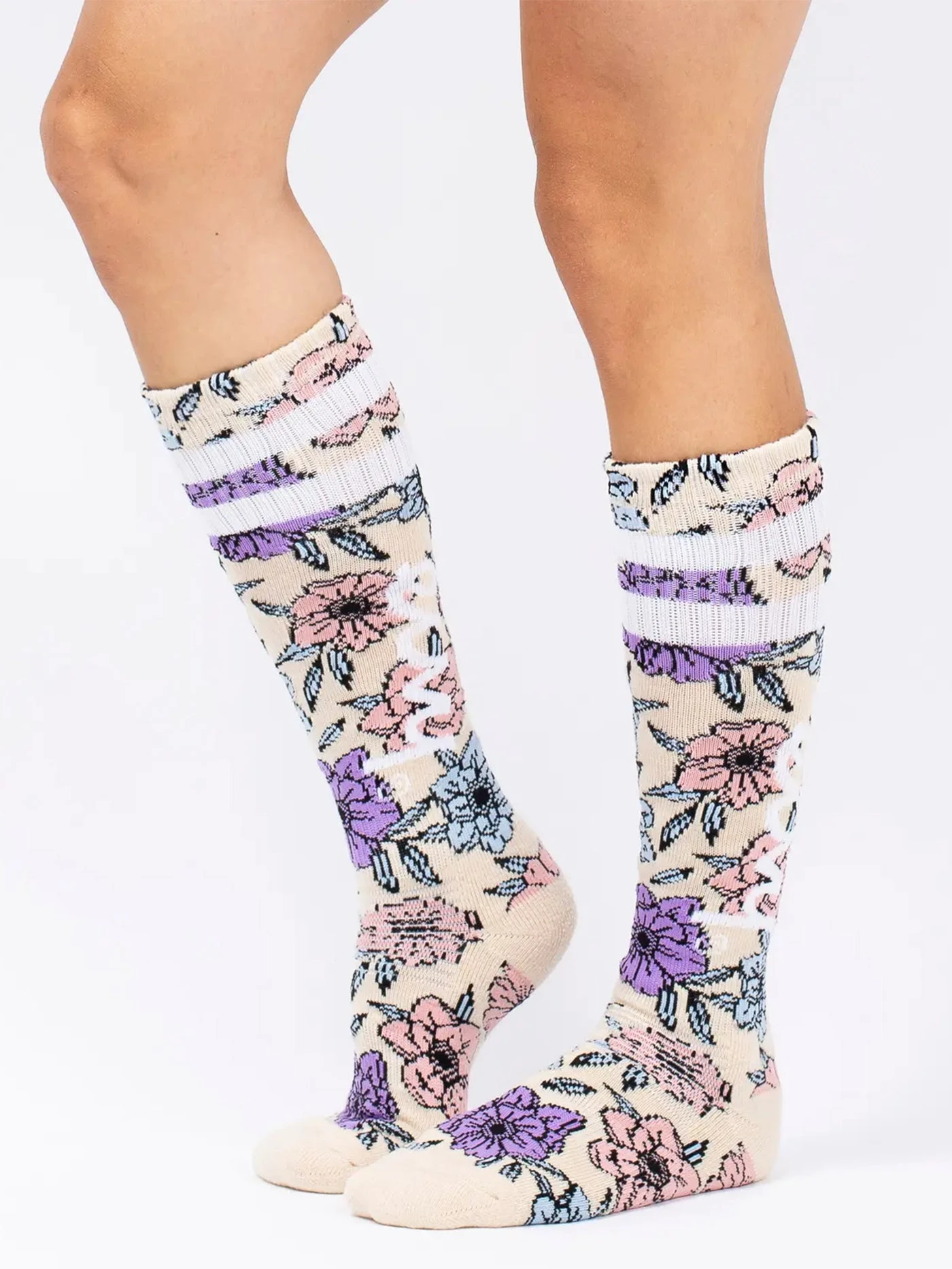 Flowery skisock loaded with tech to stop you from freezing in your daily life or in your ski and snowboard boots. The Cheerleader Wool Socks are as versatile as it gets, padded footbed and toe pocket, ankle flex zones and ribbed grip zones for ultimate comfort. Merino wool blend for warmth and durability.