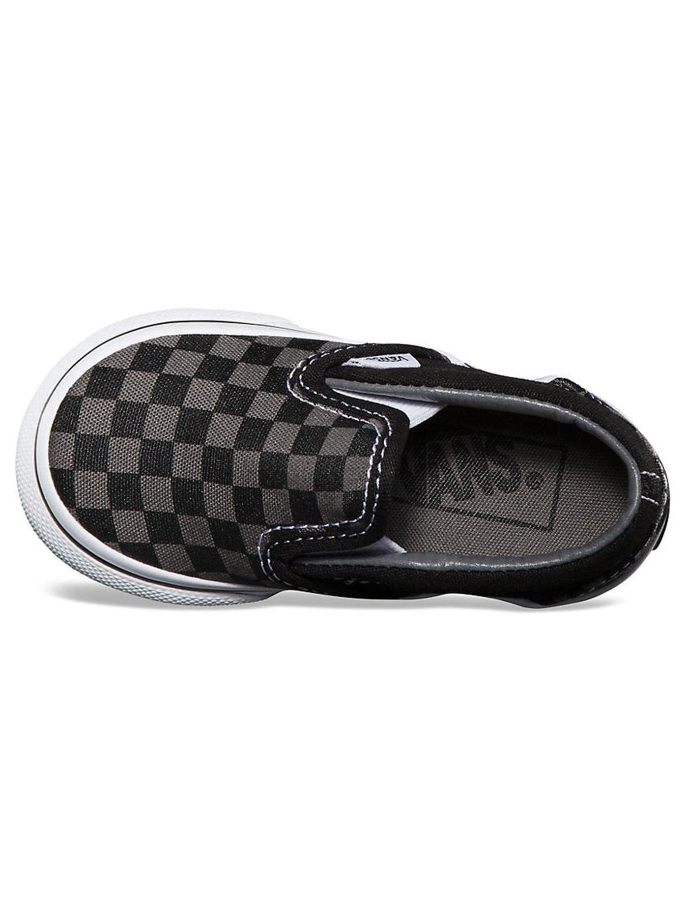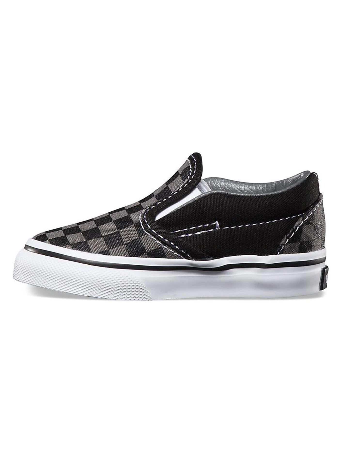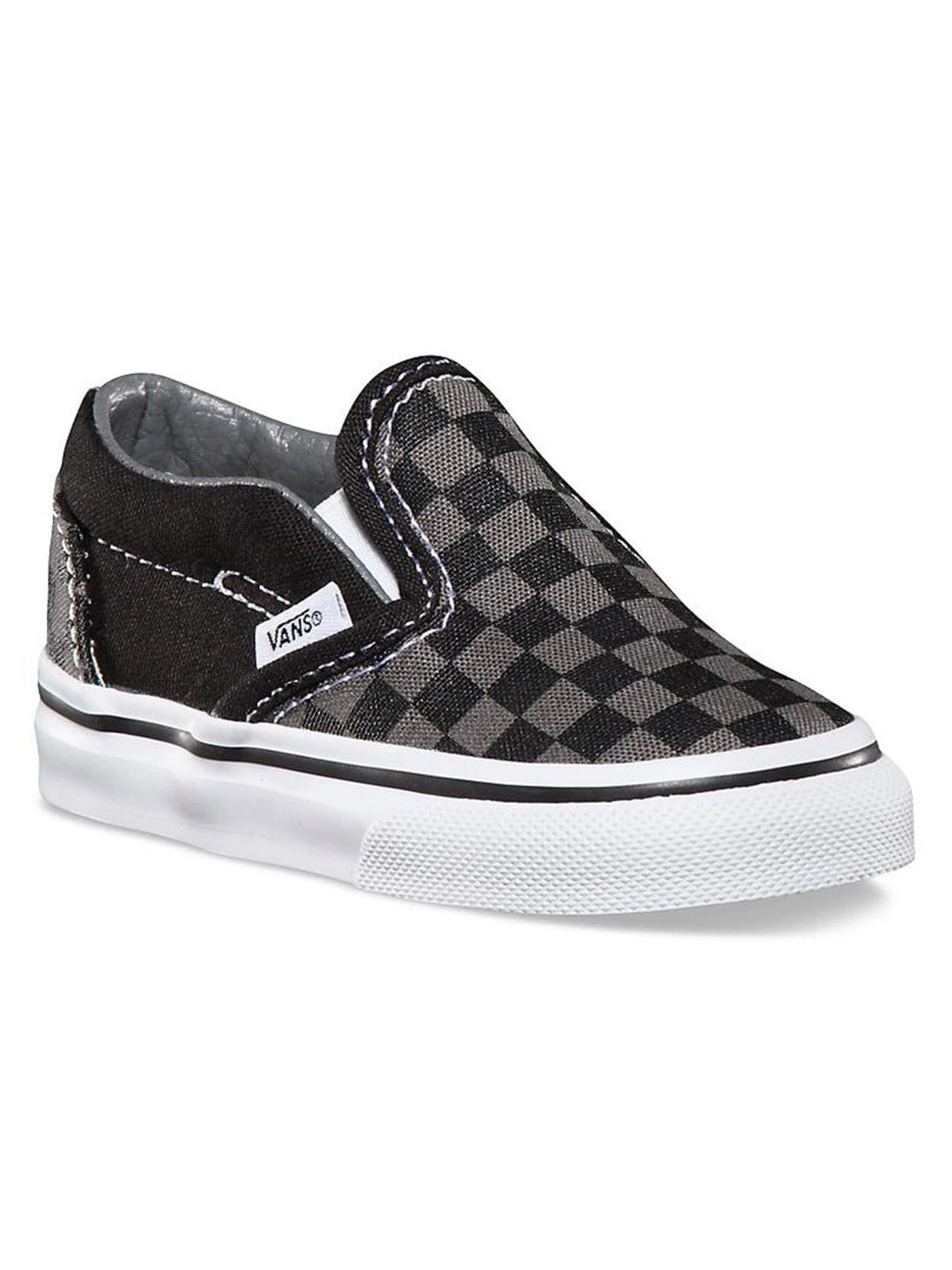 The Classic Slip-On has a low profile, slip-on canvas upper with all-over checker print, elastic side accents, Vans flag label and Vans original Waffle Outsole.