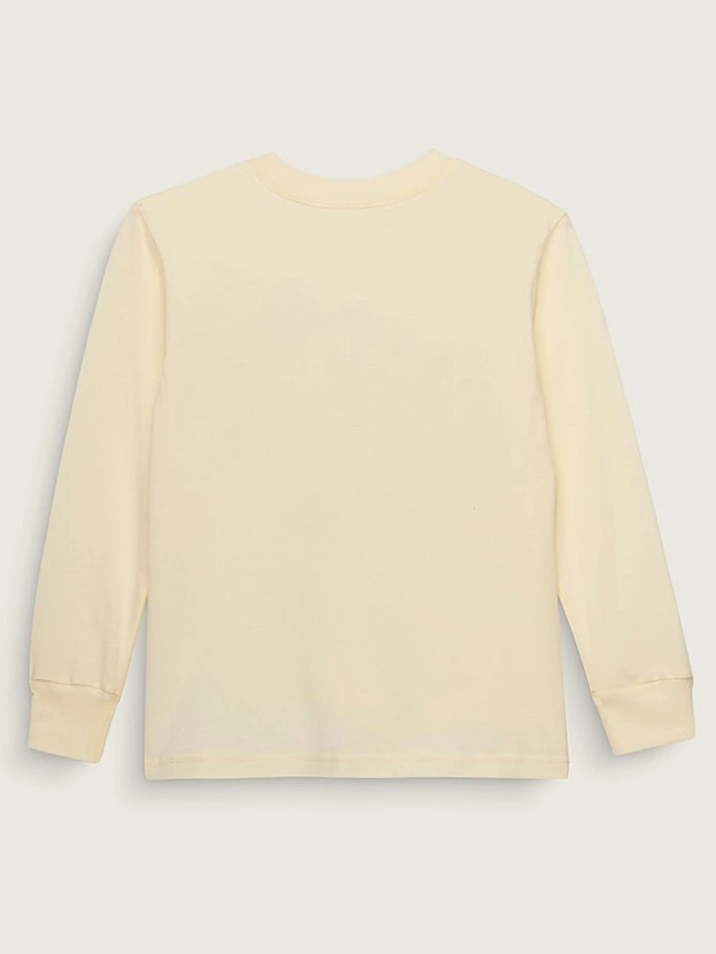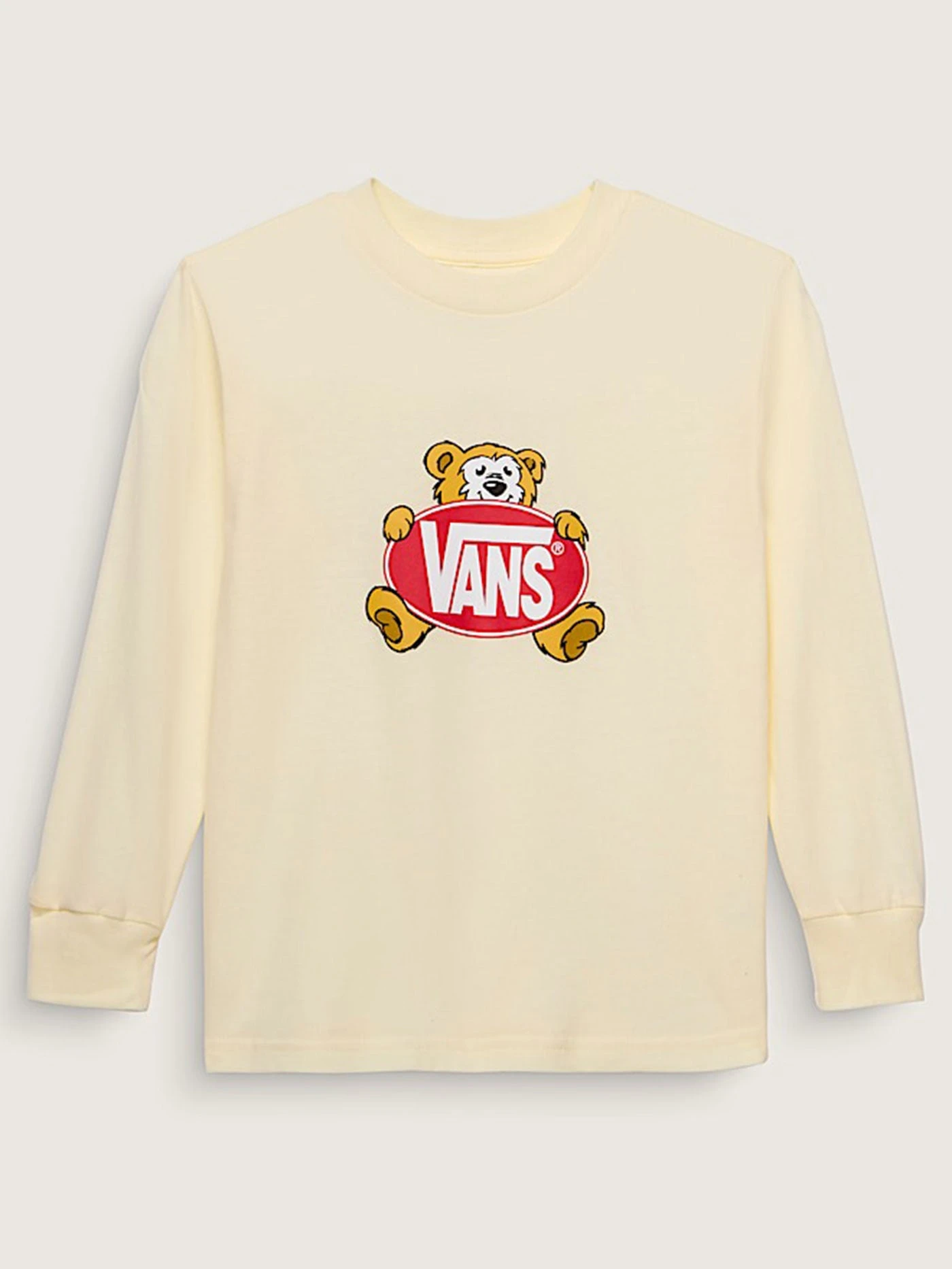Snuggle up in the Little Kids Cuddle Bear Long Sleeve T-Shirt, a long sleeve crew neck T-shirt. Featuring carded ringspun fabrication for a softer, smoother shirt, it also showcases a graphic of a cute bear hugging a shield with the Vans® logo on the front.