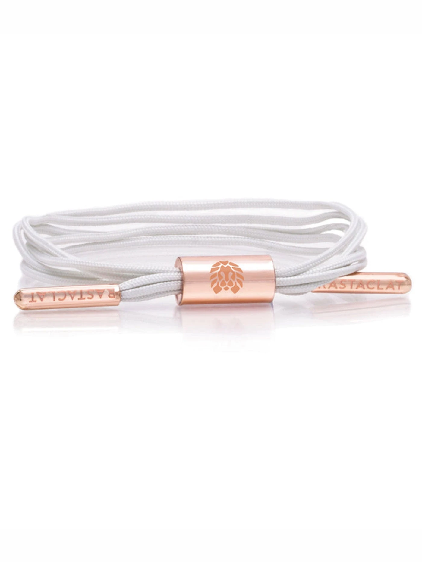 WHITE WOMEN’S MULTI LACE BRACELET FEATURING ELECTROPLATED PEACH GOLD HARDWARE AND LASER ETCHED EMBLEMS.