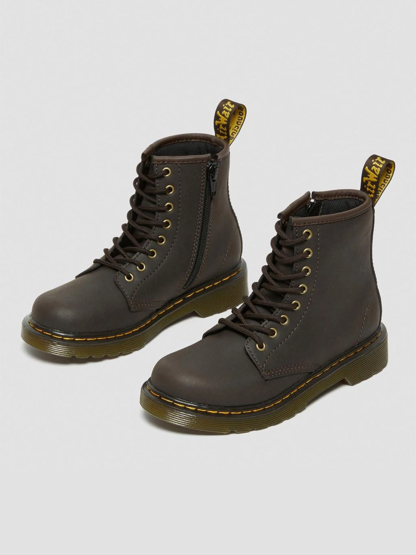 Small AirWair sole. Big Docs spirit. We’ve scaled down our classic 1460 boots for up-and-coming rebels. Built from robust, waxy Wildhorse Lamper leather, this 1460 Kids’ boot sits on a rugged air-cushioned sole and is finished with yellow stitching and a scripted heel loop. Comes with an extra pair of laces. Just in case.
