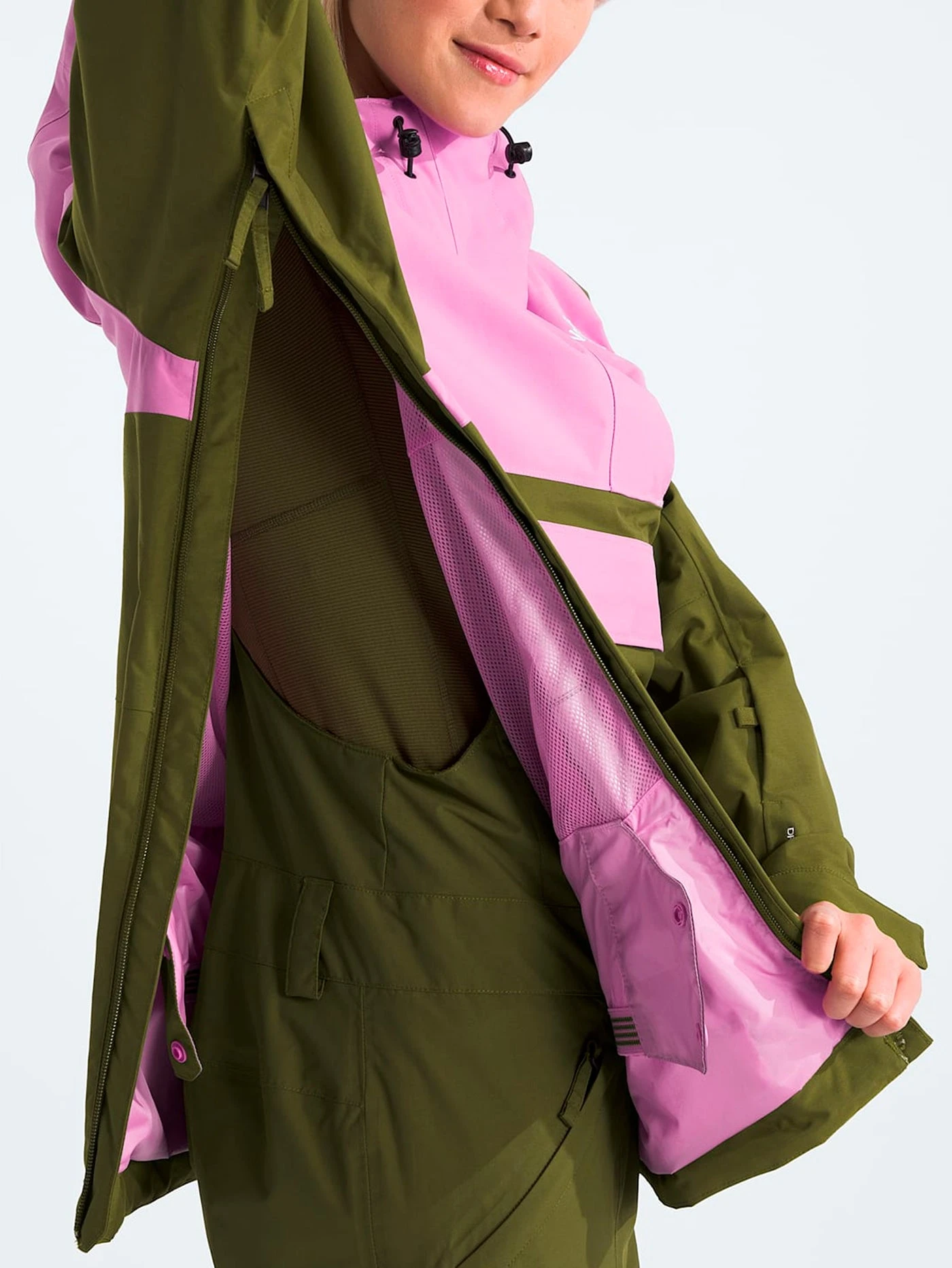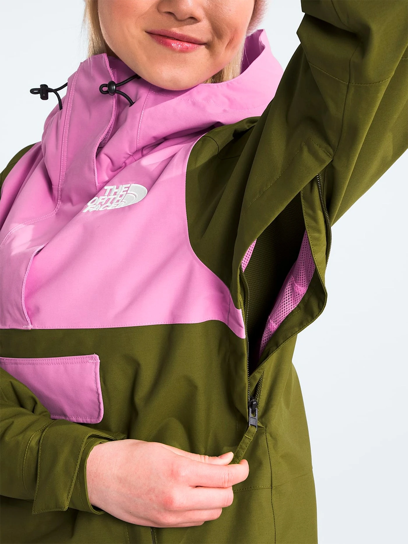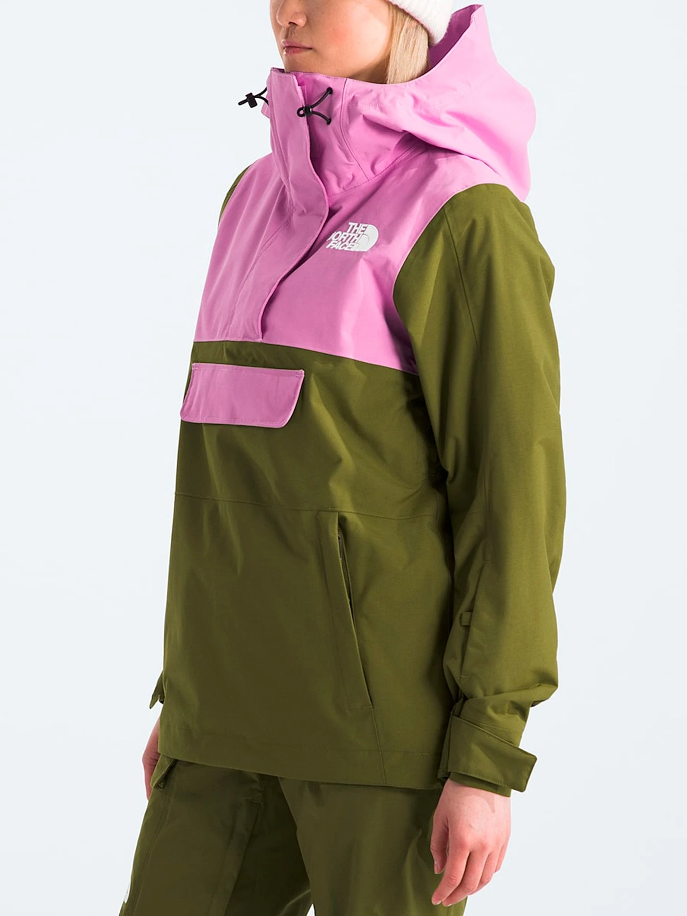 The Women’s Driftview Anorak uses a waterproof, seam-sealed DryVent™ fabric and an attached, helmet-compatible hood for full on-mountain coverage. Stacked kangaroo pockets provide on-the-go storage, and the side entry design makes it easy to remove when back at the lodge.