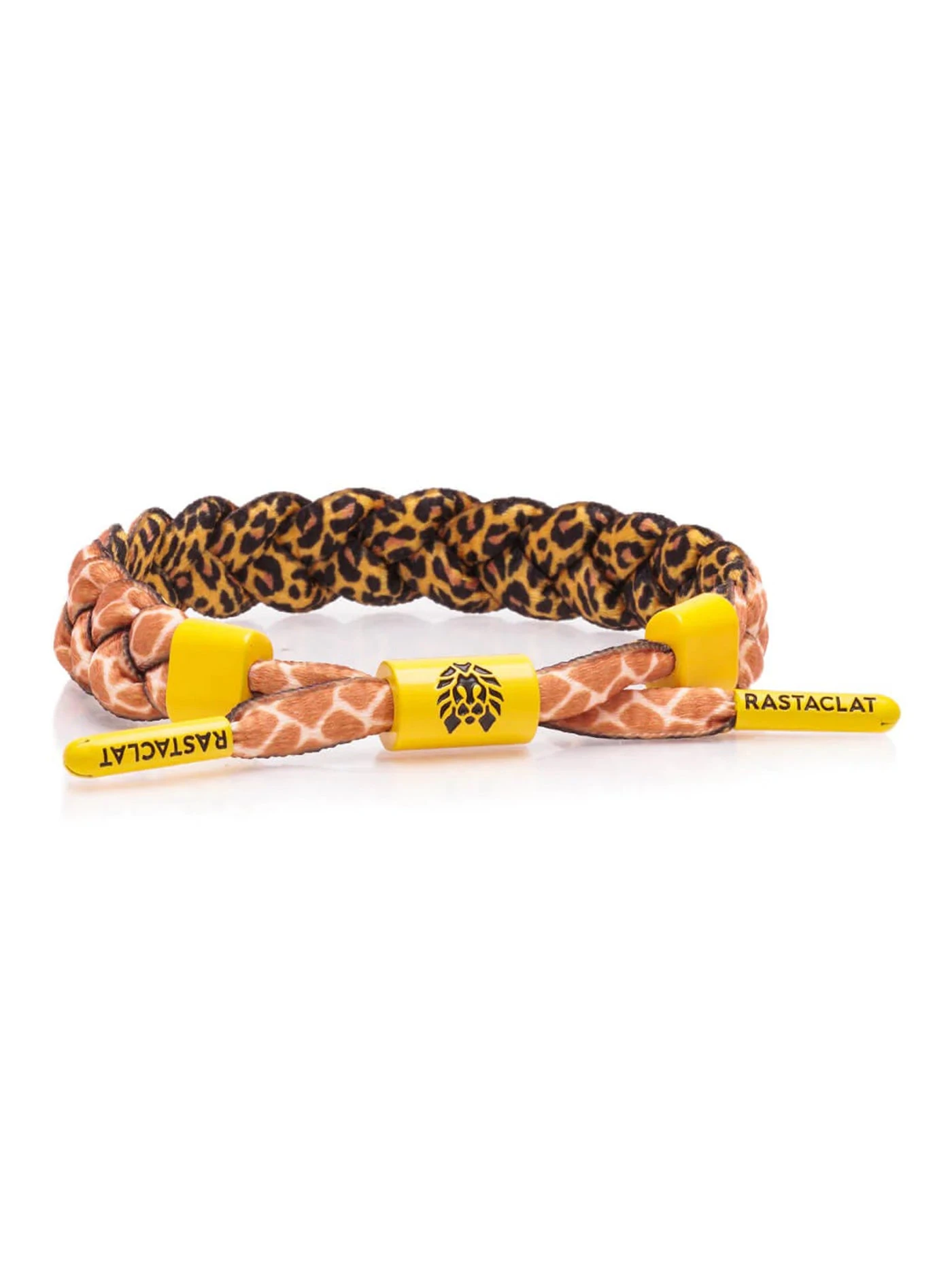 FLIP IT AND REVERSE IT. THIS REVERSIBLE BRAIDED BRACELET FEATURES A GIRAFFE PRINT ON THE OUTER LACE, CHEETAH PRINT ON THE INNER LACE AND ENAMEL HARDWARE WITH CONTRAST EMBLEMS. IT EVEN COMES IN AN EXCLUSIVE RASTACLAT COLLECTOR’S BOX.