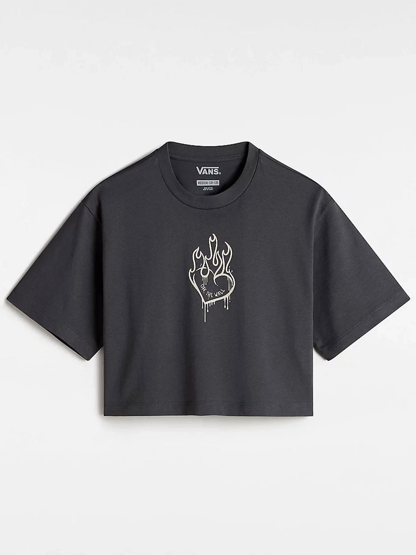 Fan the flames in the Kids Fire In Your Heart T-Shirt, a short sleeve cropped crew neck T-shirt with a relaxed fit. Made of heavyweight cotton jersey, it features a graphic of a flaming heart on the front.