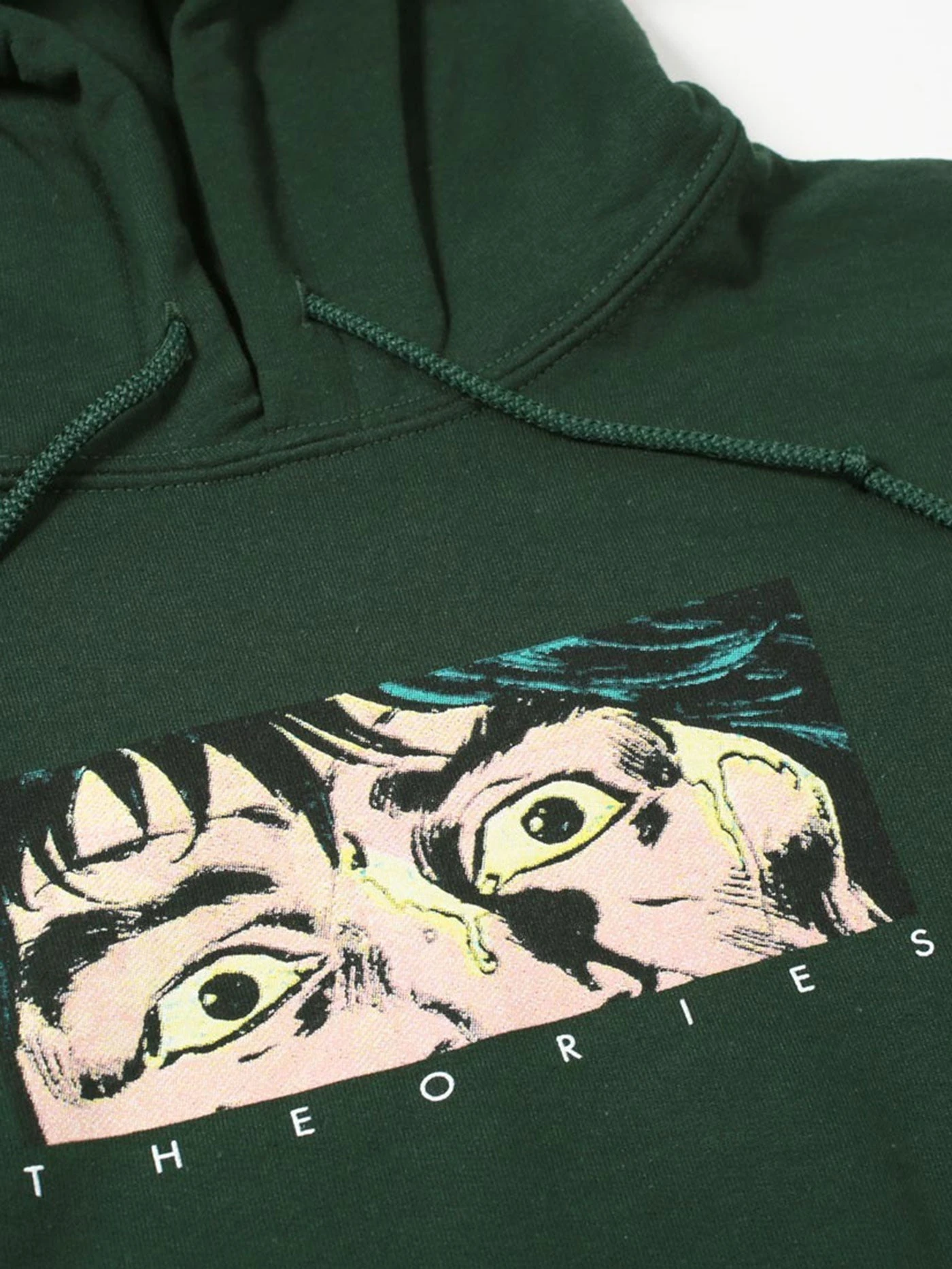 From Theories contributing artist, Jevante Smith, the Fixate hoodie is a small glimpse into the comic-inspired deck graphic he also designed for this season. Available here in a cool dark forest color on our new slightly heavier-weight hoodie stock.