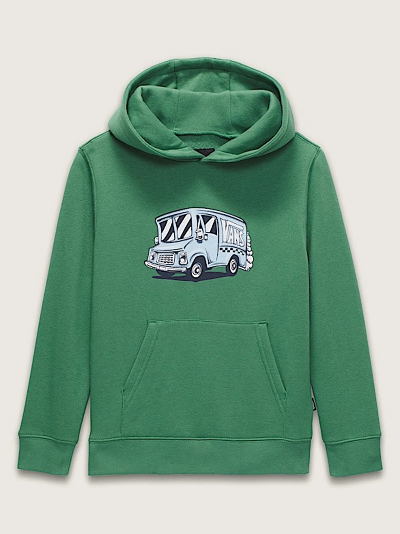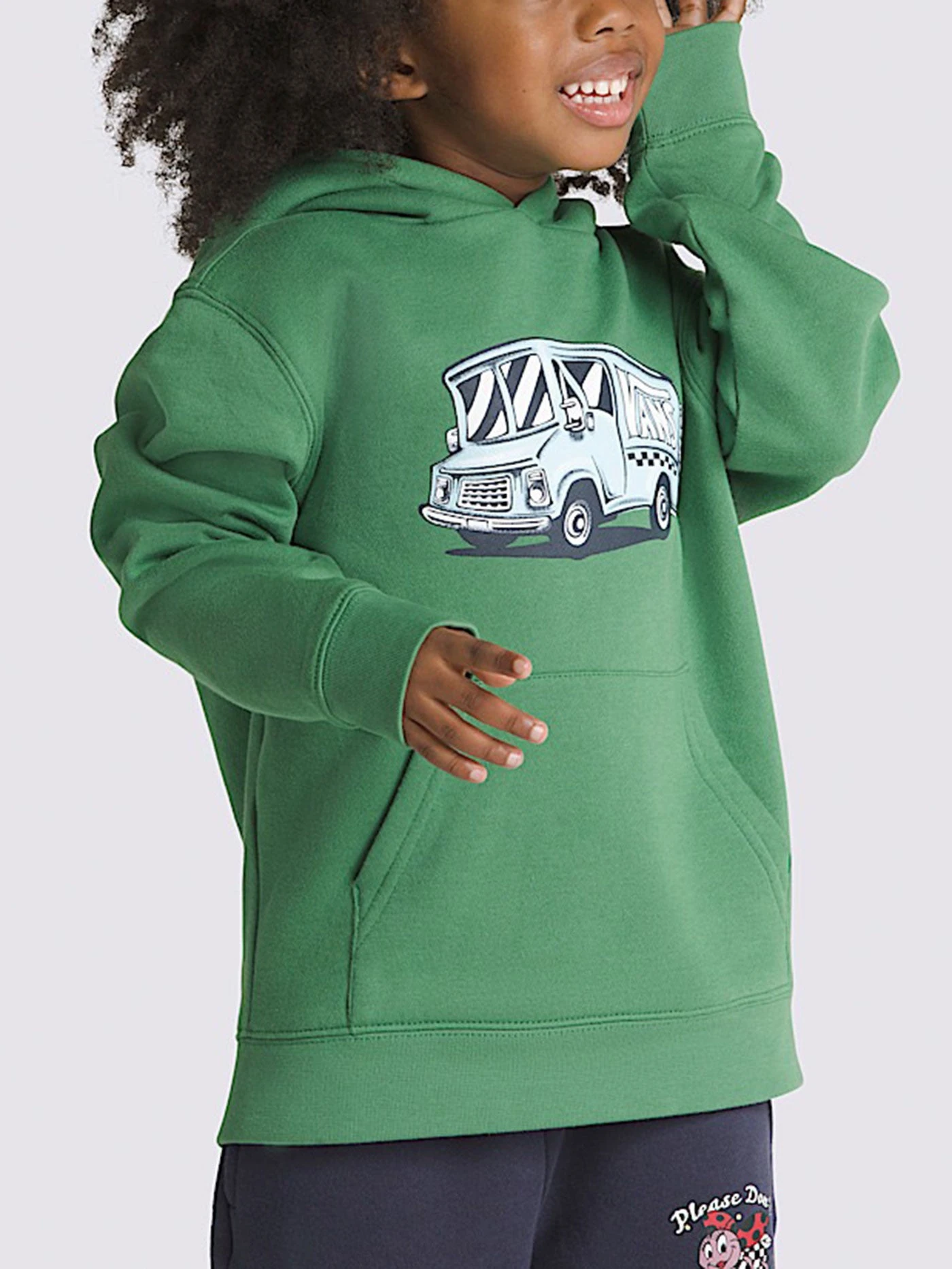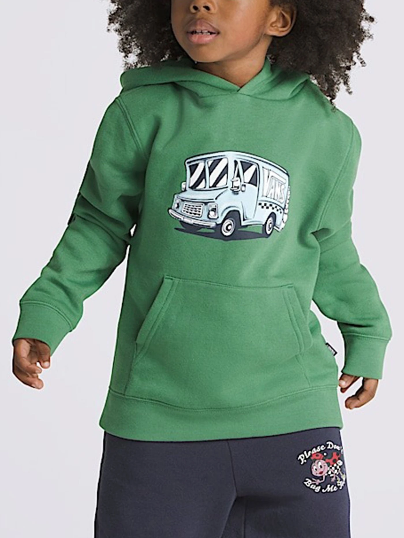 The Little Kids Free Shipping Pullover Hoodie is a classic pullover hoodie made of warm and cozy brushback fleece. It also features ribbed details with a screenprinted graphic of a delivery van with a Vans® logo on the front.