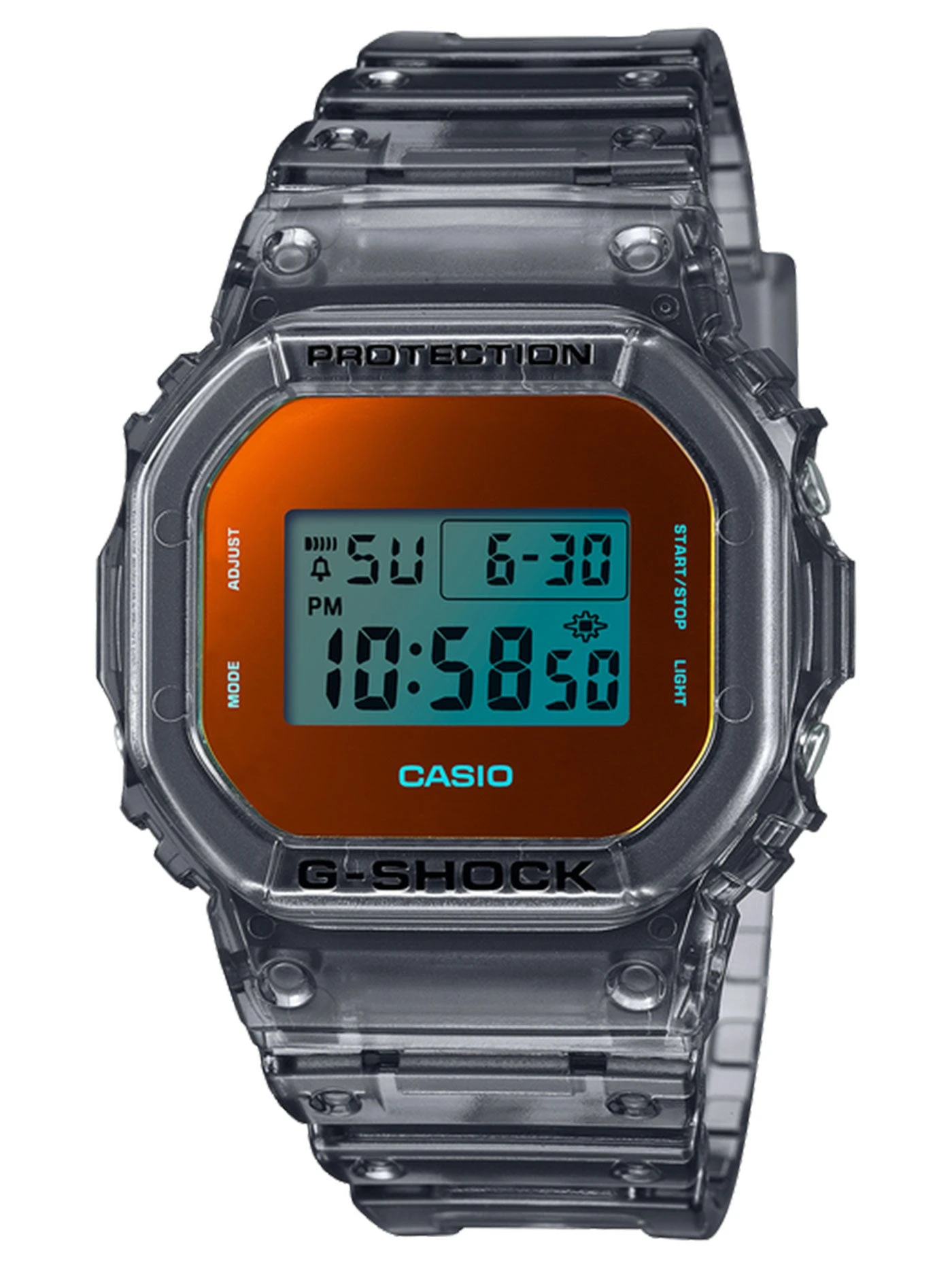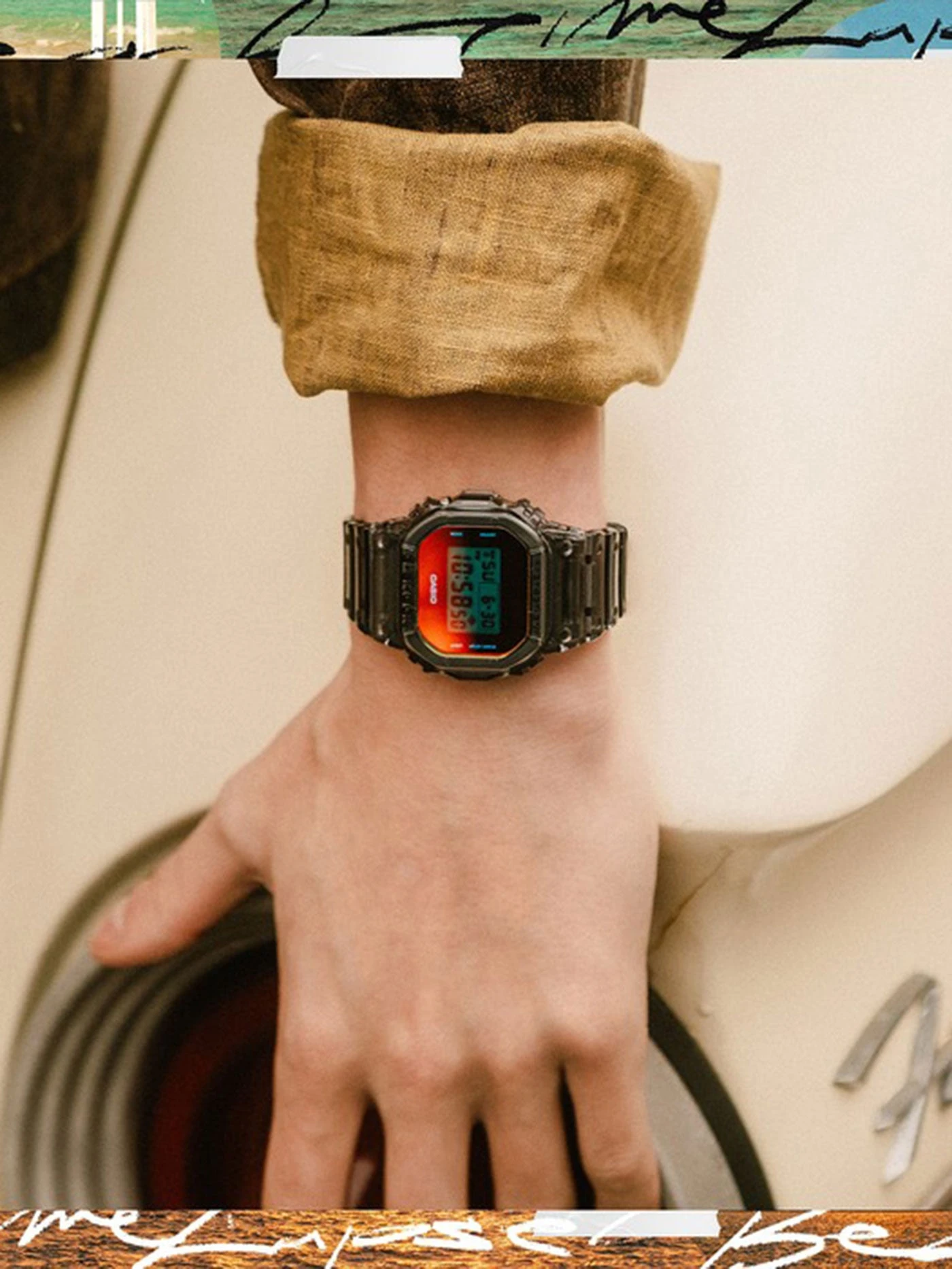 Set your mood to summertime and easy with a radiant G-SHOCK featuring a watch face in eye-catching color. This special vapor deposition process reflects various hues of light, capturing the vistas of the ever-changing seaside. These beach-inspired designs come in two color schemes — fresh white and blue evoking sun-drenched white sandy beaches, and cool translucent grey and orange conjuring the serenity of the beach at dusk. Thanks to this special coloring process, each watch shines with a different radiance for a one-of-a-kind look that is truly your own. Choose your beach look in any of three popular G-SHOCK shapes — the DW-5600 with its iconic form, the octagonal GA-2100 and the GA-110 with large case. With dynamic color expressions that change depending on the viewing angle, these cool, fashionable watches add a bold accent to any style.
