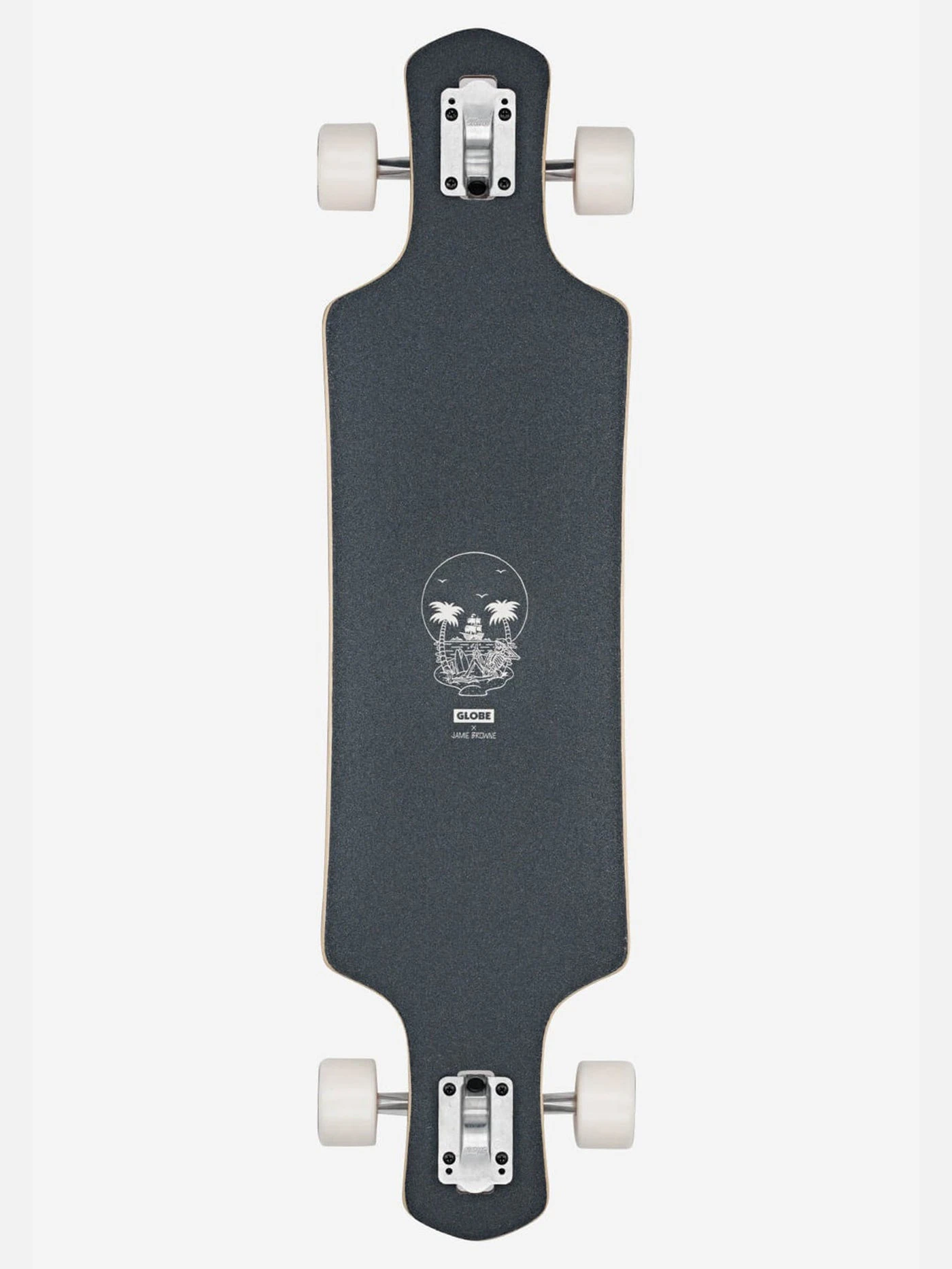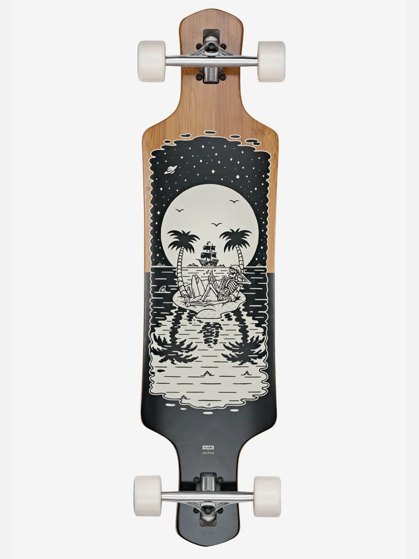 Symmetrical drop-through cutaway board for cruising, slopes, and beginner to intermediate downhill. The Geminon 37.5 in Reflection features bamboo & hard rock maple construction with mellow side to side concave, reverse kingpin Slant trucks, 78a soft-core wheels & graphics from artist Jamie Browne.