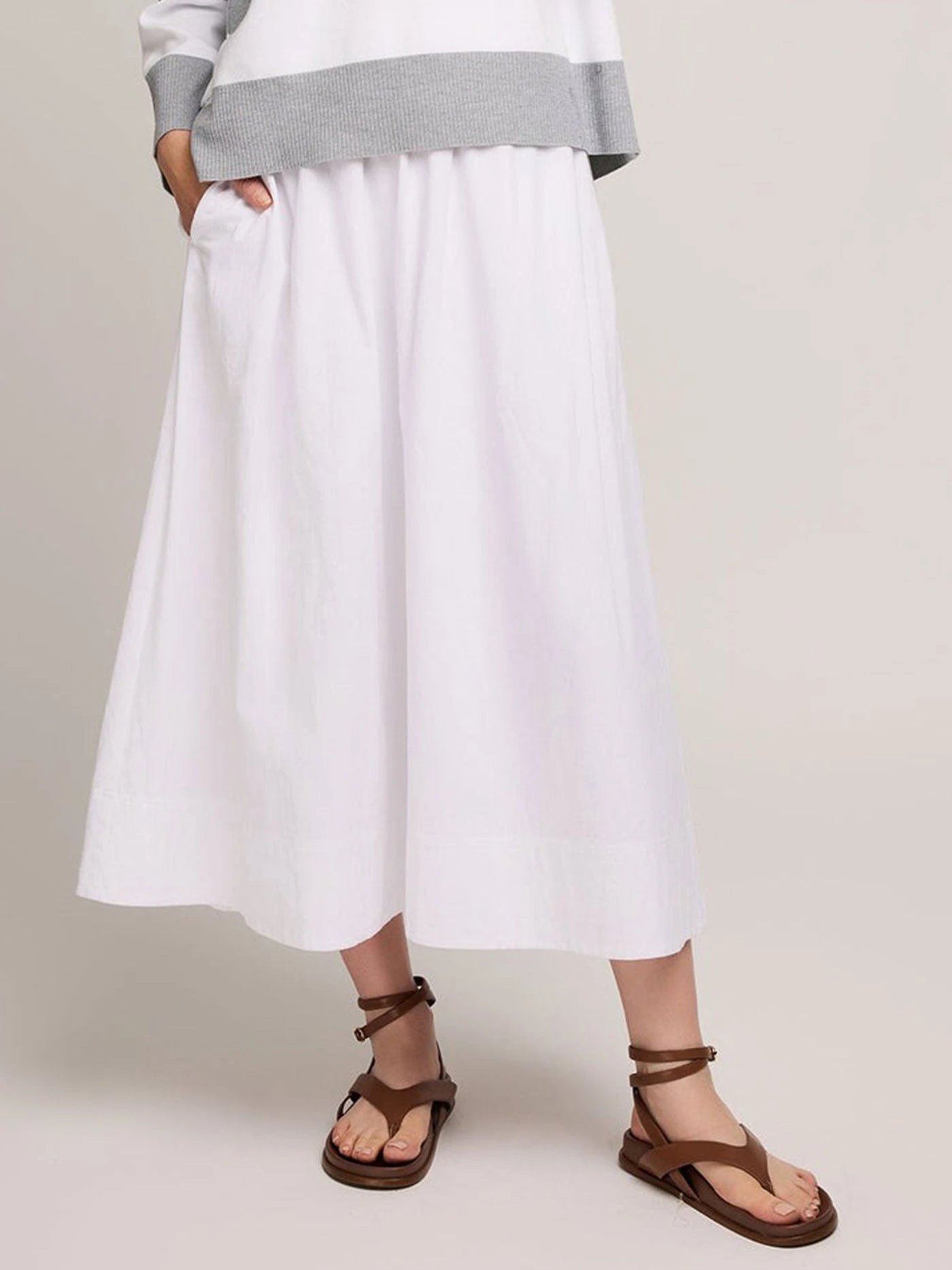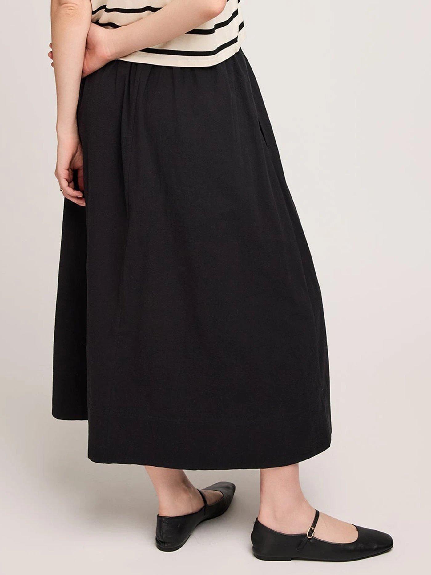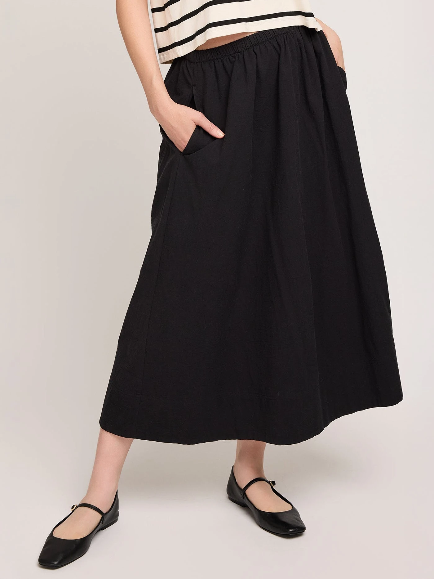 The Geneva skirt is made of a cotton poplin with a light crinkle texture and is fully lined for ease of wear. Features include an elasticated waistband and inseam pockets.