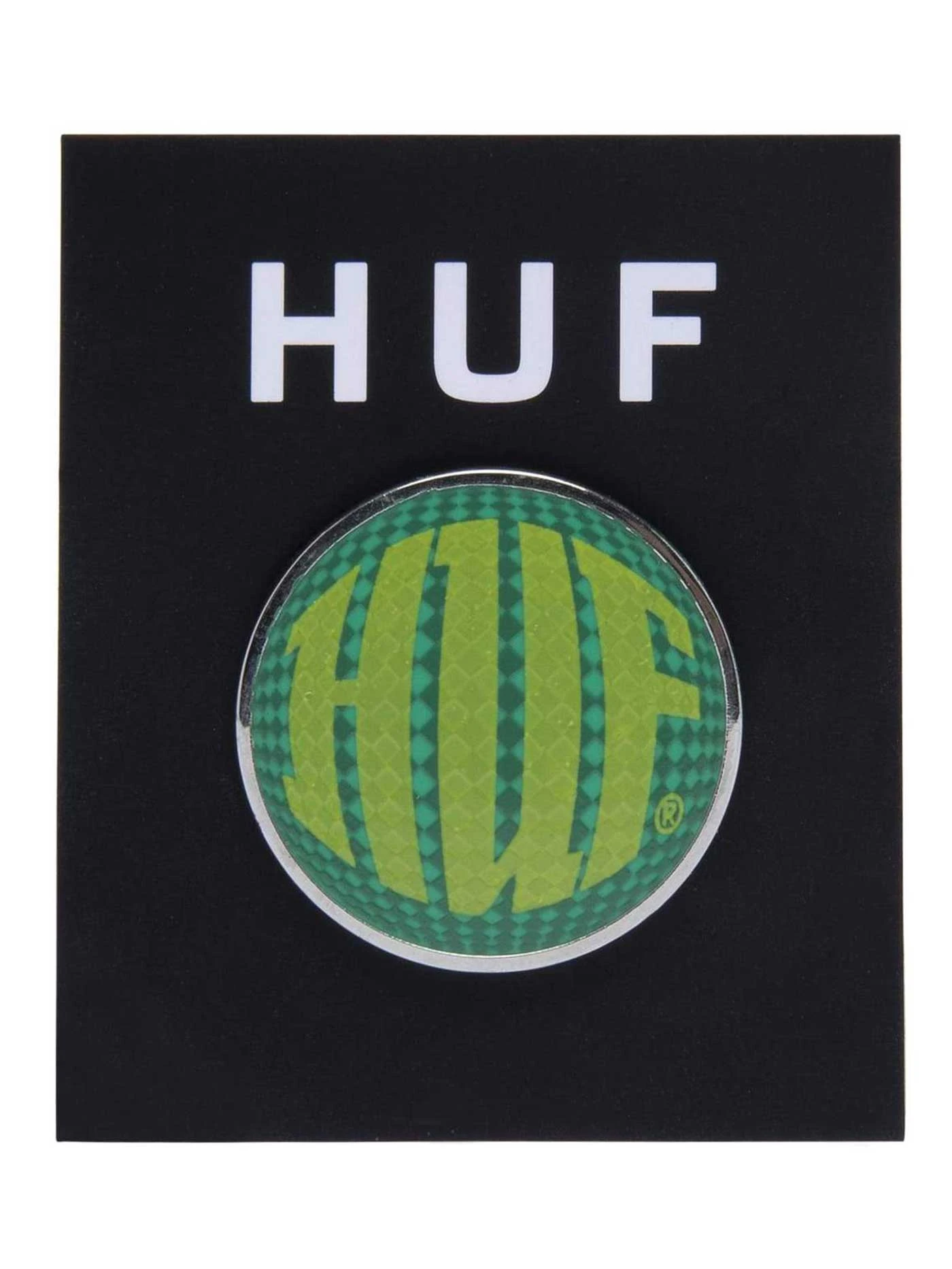 The Hi-Fi Pin is made of antique nickel and features an op-art-inspired HUF logo in enamel at the face as a nod to 90s rave art and skate fisheye lens perspectives.