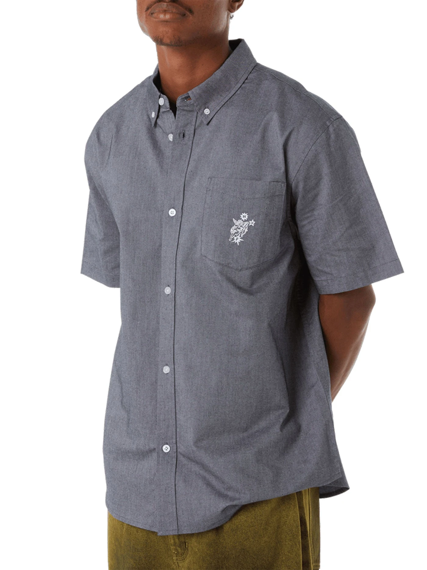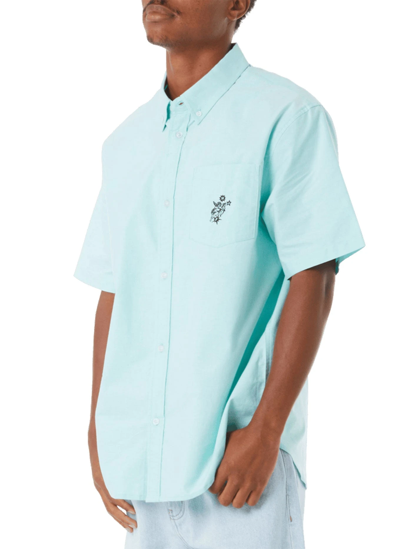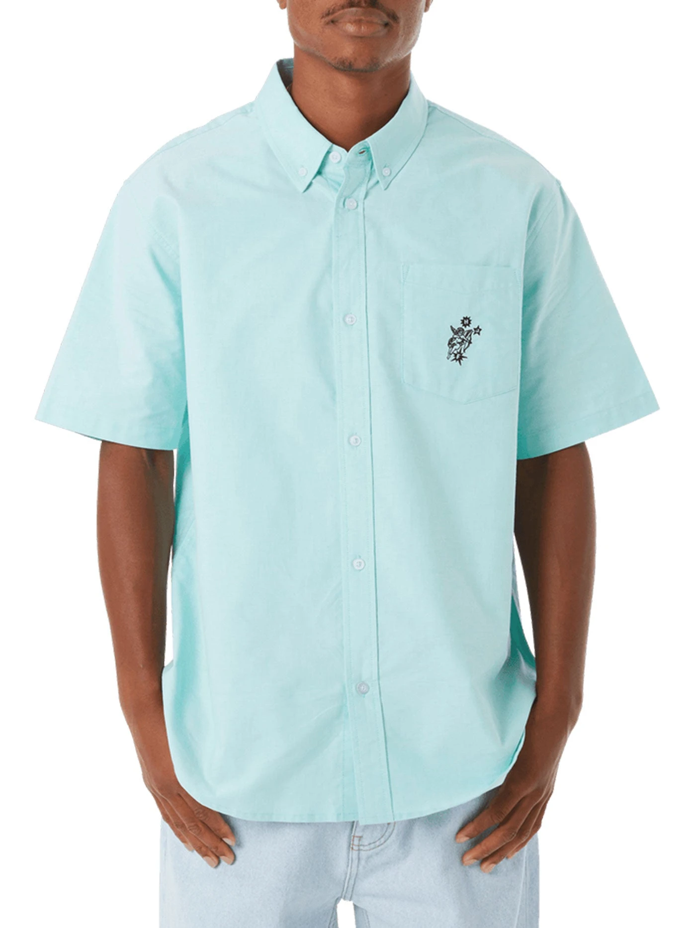 Offered in two Spring colorways, the Icarus S/S Oxford shirt adds subtle embroidered artwork to a staple fit 100% cotton short sleeve oxford shirt with custom engraved summarys.
