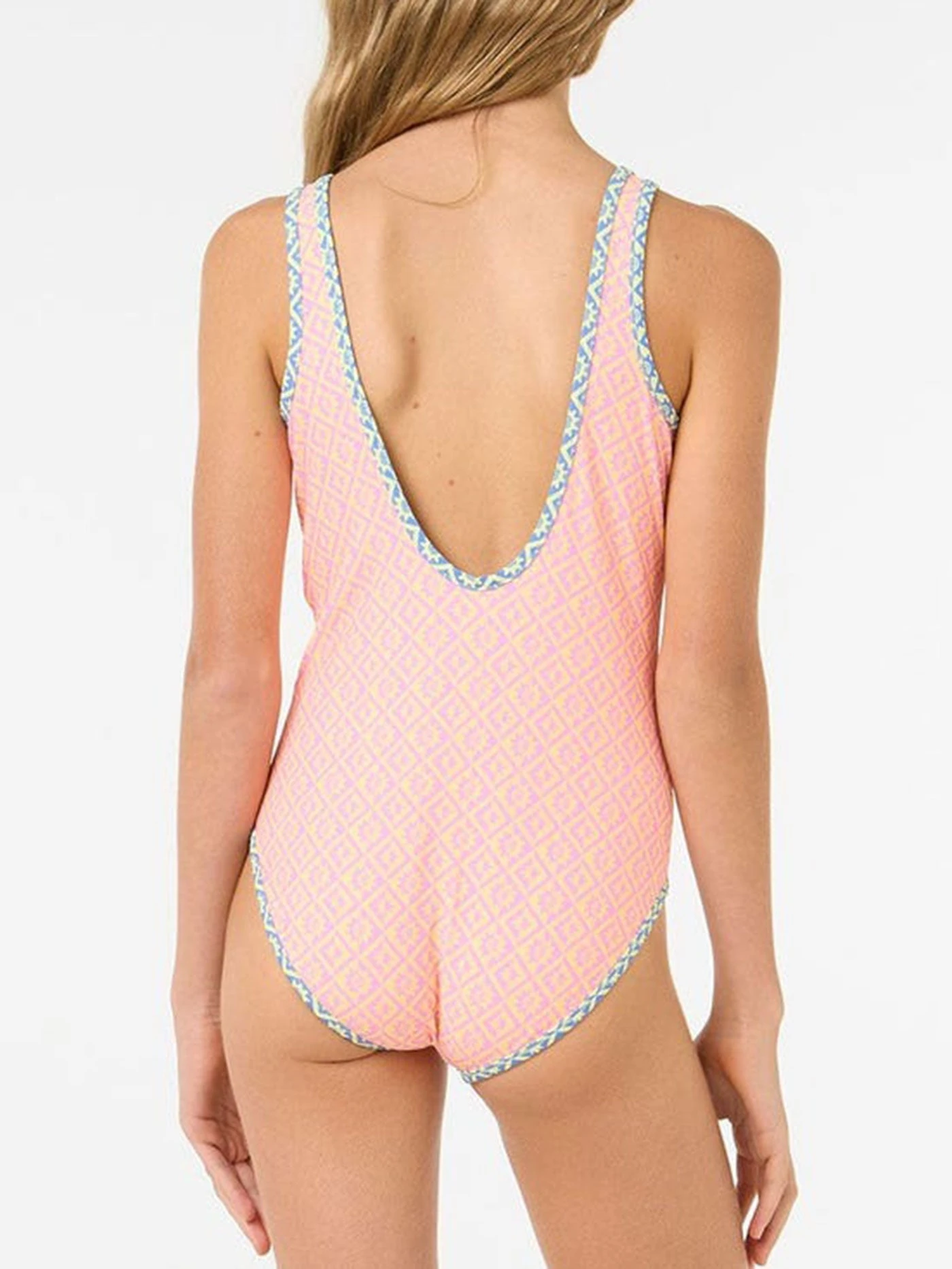 The Island Revo One Piece for girls (8-14 years) is made from warpknit Lycra® Extra Life™ fabric. It features a standard fit with an all-over yardage print, reversible design, and chlorine-friendly properties, making it ideal for active young swimmers.