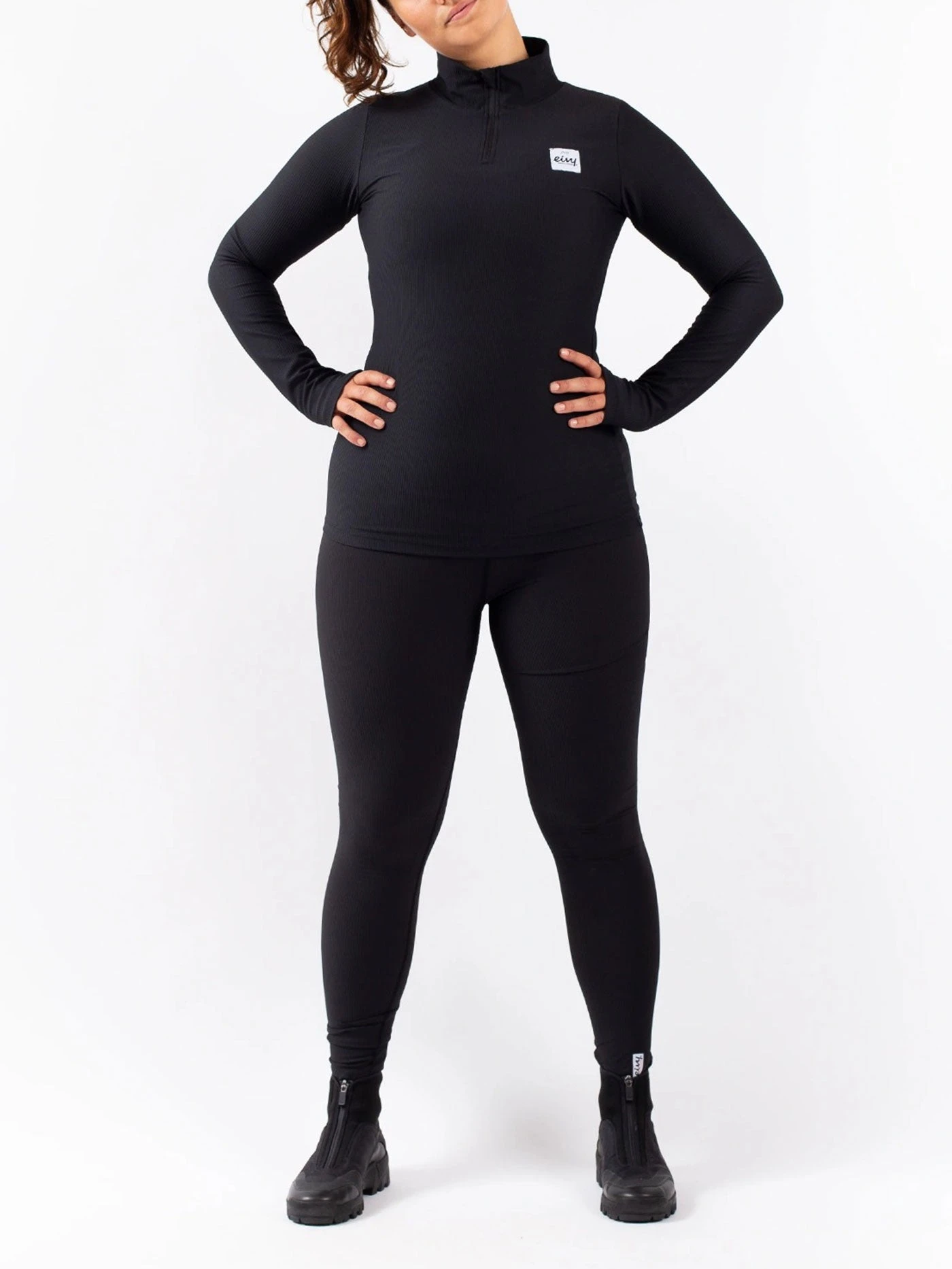 Our black ribbed Journey model is a base layer designed in a body-hugging fit with a shorter zipped collar. Fits just as well on the slopes as on the after ski or on the run and in your everyday life. The body-hugging fit allows you to wear multiple layers of clothing on top during the coldest days, and the integrated thumbholes ensure that the sleeves stay in place even when layered over.