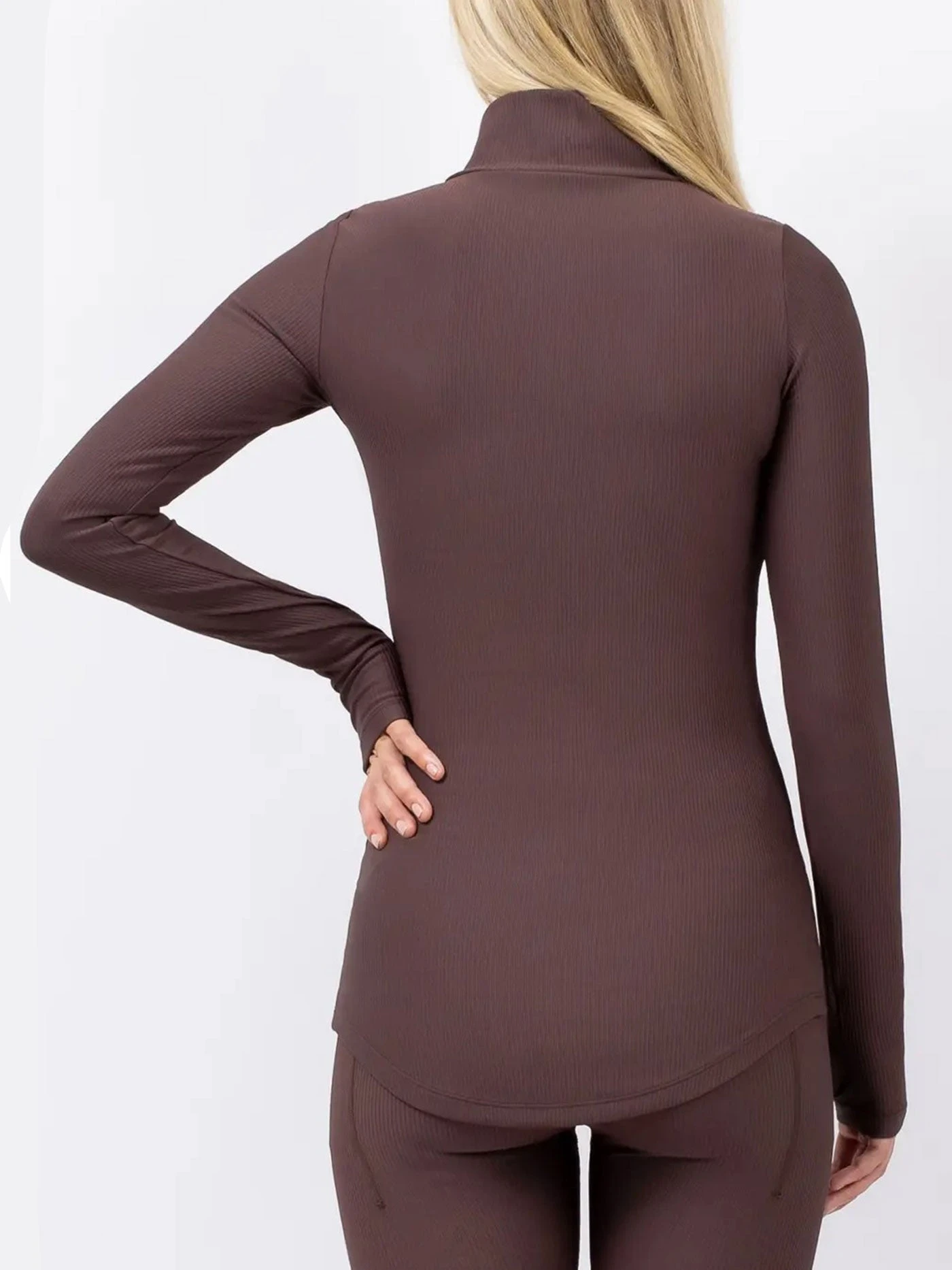 Our brown & ribbed Journey model is a base layer designed in a body-hugging fit with a shorter zipped collar. Fits just as well on the slopes as on the after ski or on the run and in your everyday life. The body-hugging fit allows you to wear multiple layers of clothing on top during the coldest days, and the integrated thumbholes ensure that the sleeves stay in place even when layered over.
