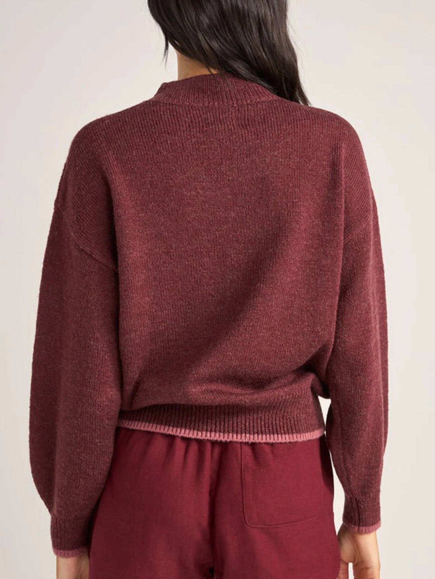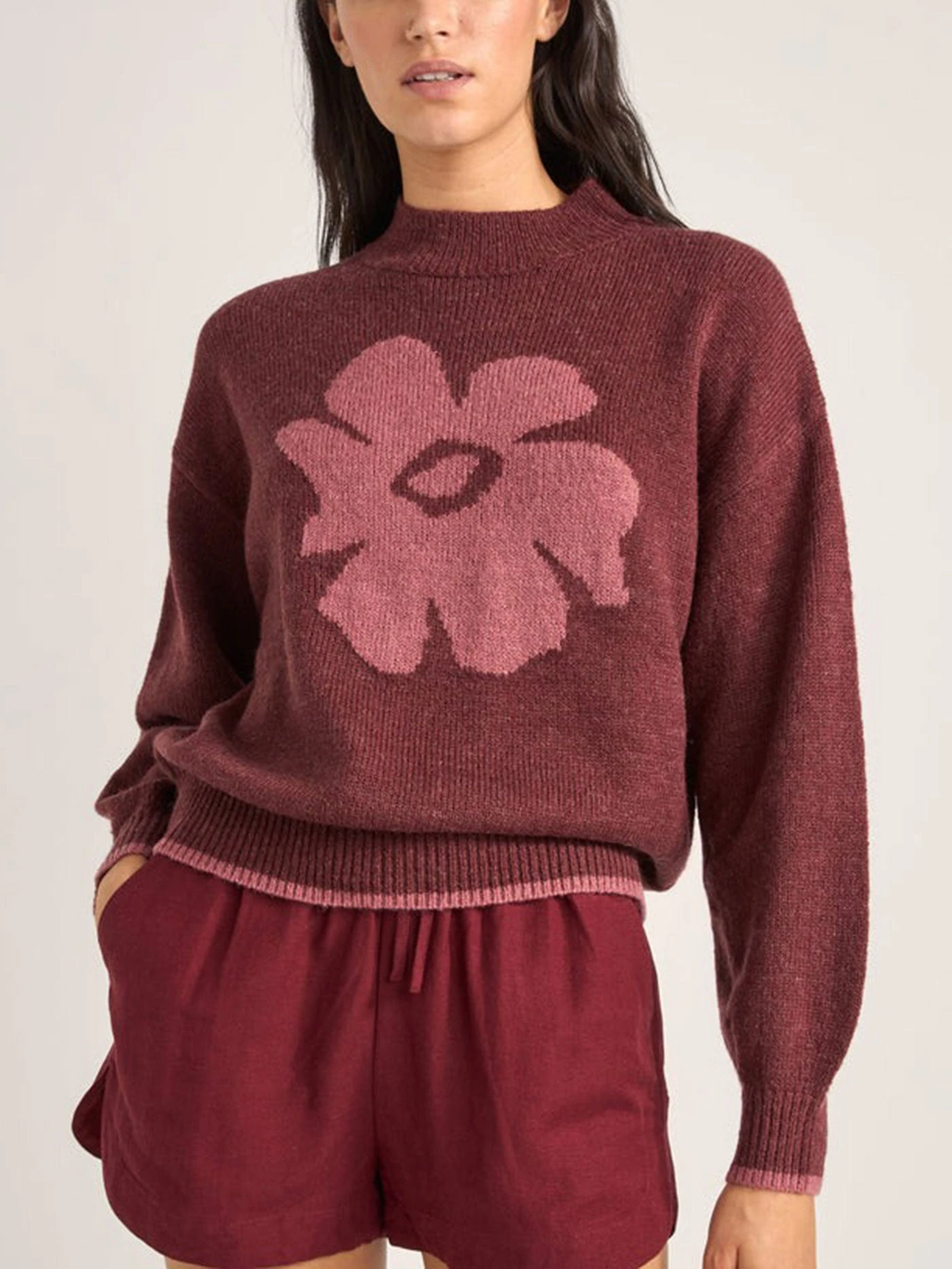 The Juliet Floral Jumper in Burgundy offers a relaxed fit and cropped length, blending floral style with coastal comfort. Ideal for breezy summer evenings.