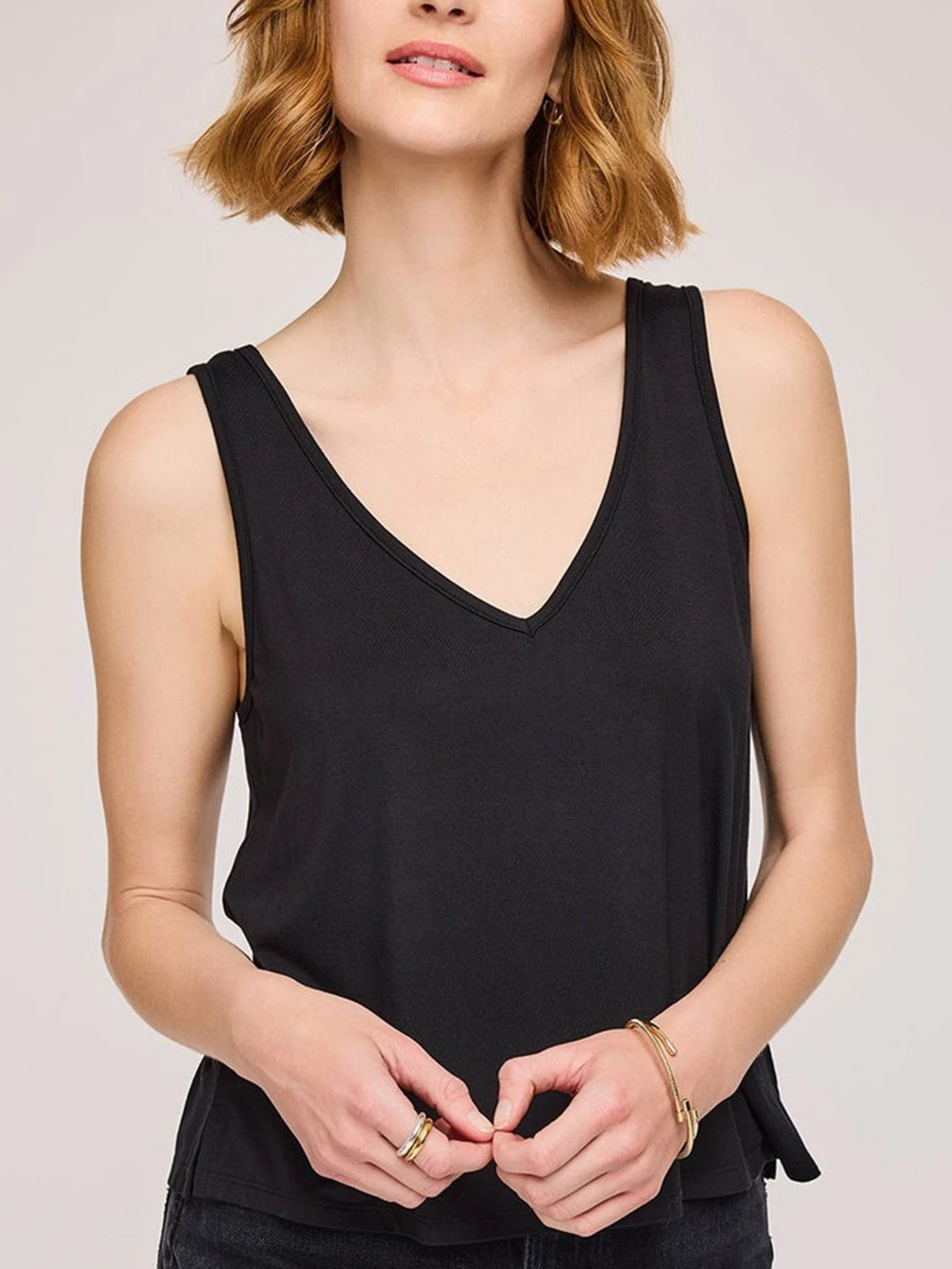 The Kai tank is made of super soft EcoVero rayon jersey. Features include a front and back v-neckline and side slits.