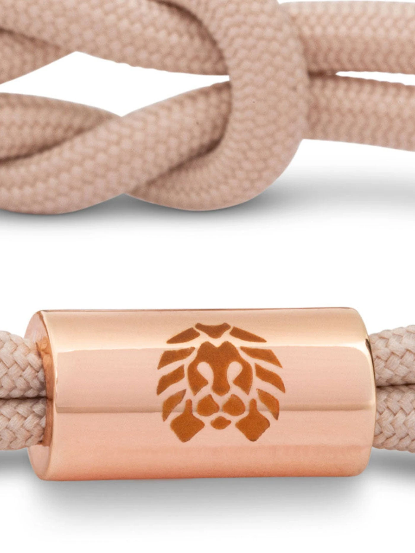 Nude small knotted bracelet featuring rose gold electroplated hardware and contrast emblems.
