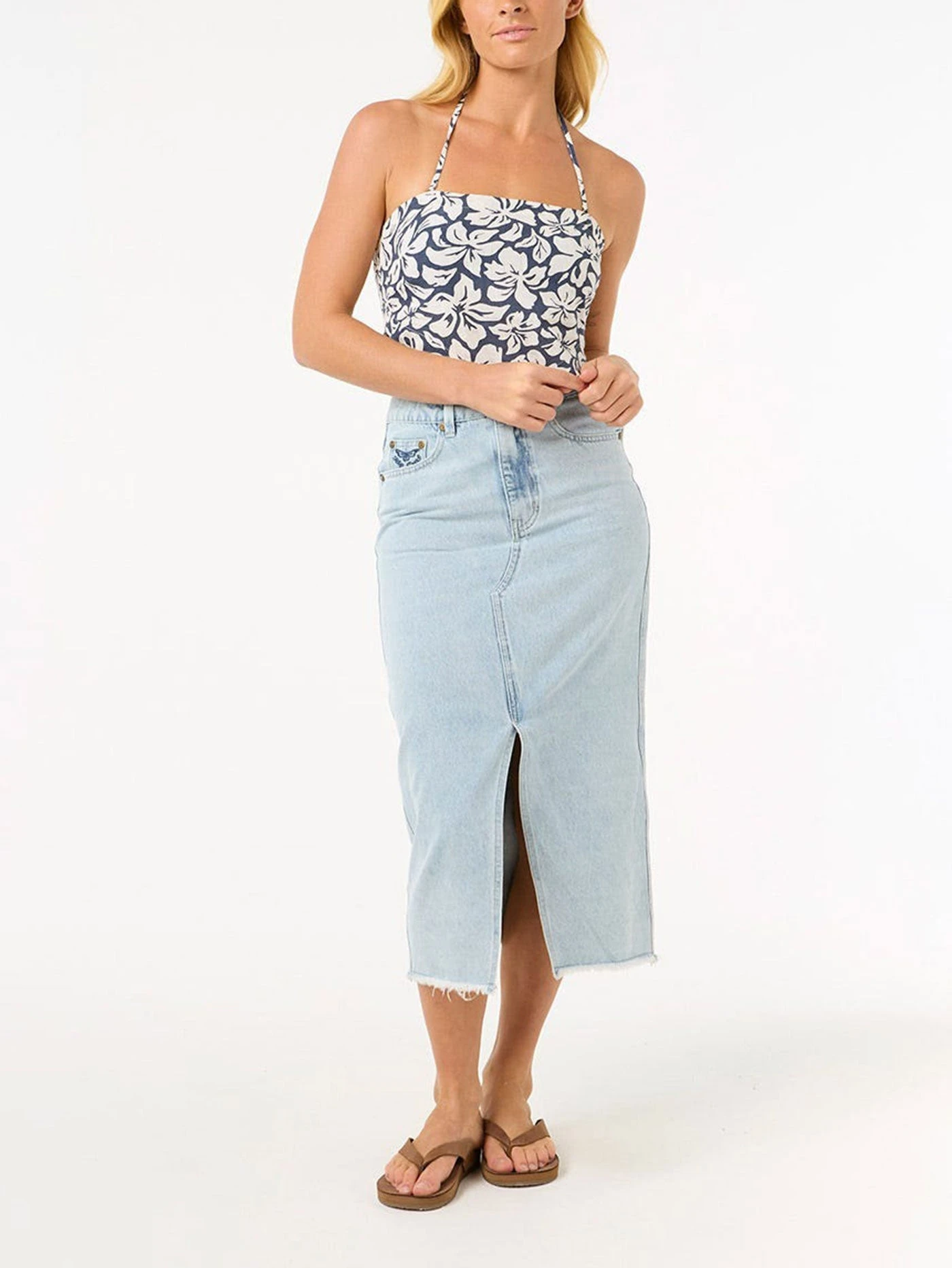 The Las Dalias Scarf Bandeau combines cotton-linen fabric with a cropped bandeau design. Featuring shirred detail at the back, all-over yardage print, and metal logo trim, it’s a versatile and stylish surf accessory.