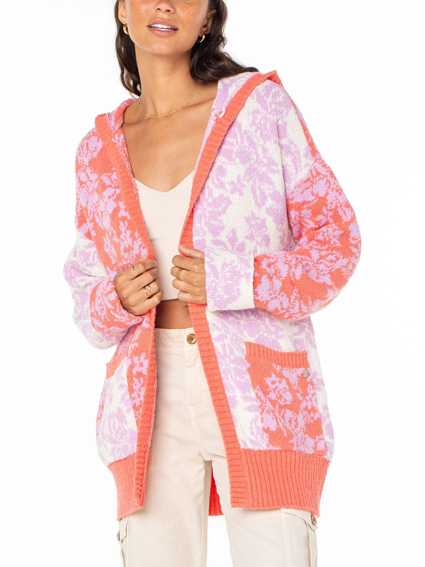 The Laurel cardigan is a flirty and fun spring statement. With its bright and playful pinks and purples, this comfortable piece does not sacrifice style.