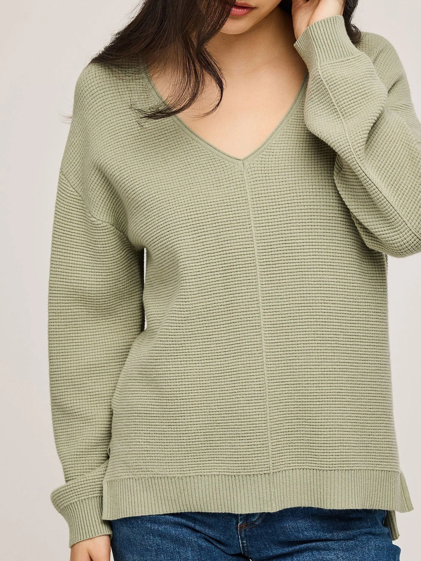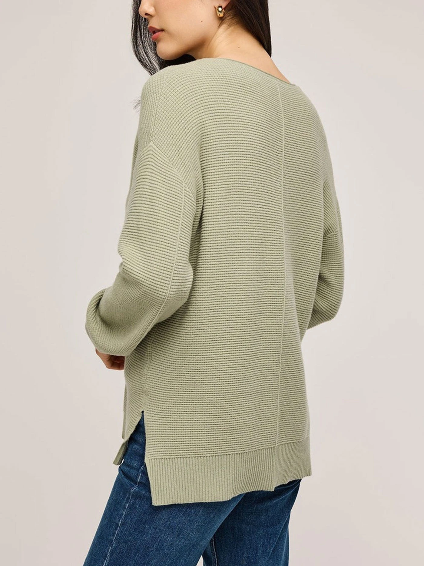 The Lisbon sweater is made of a soft yarn in a waffle knit pattern. Features include side slits and exposed seam details.
