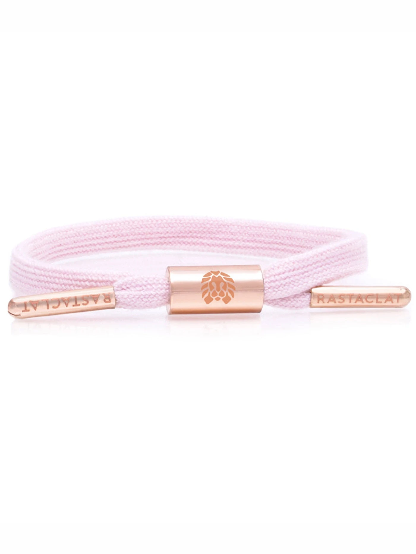 LIGHT PINK WOMEN’S SINGLE LACE BRACELET FEATURING ELECTROPLATED PEACH GOLD HARDWARE AND LASER ETCHED EMBLEMS.
