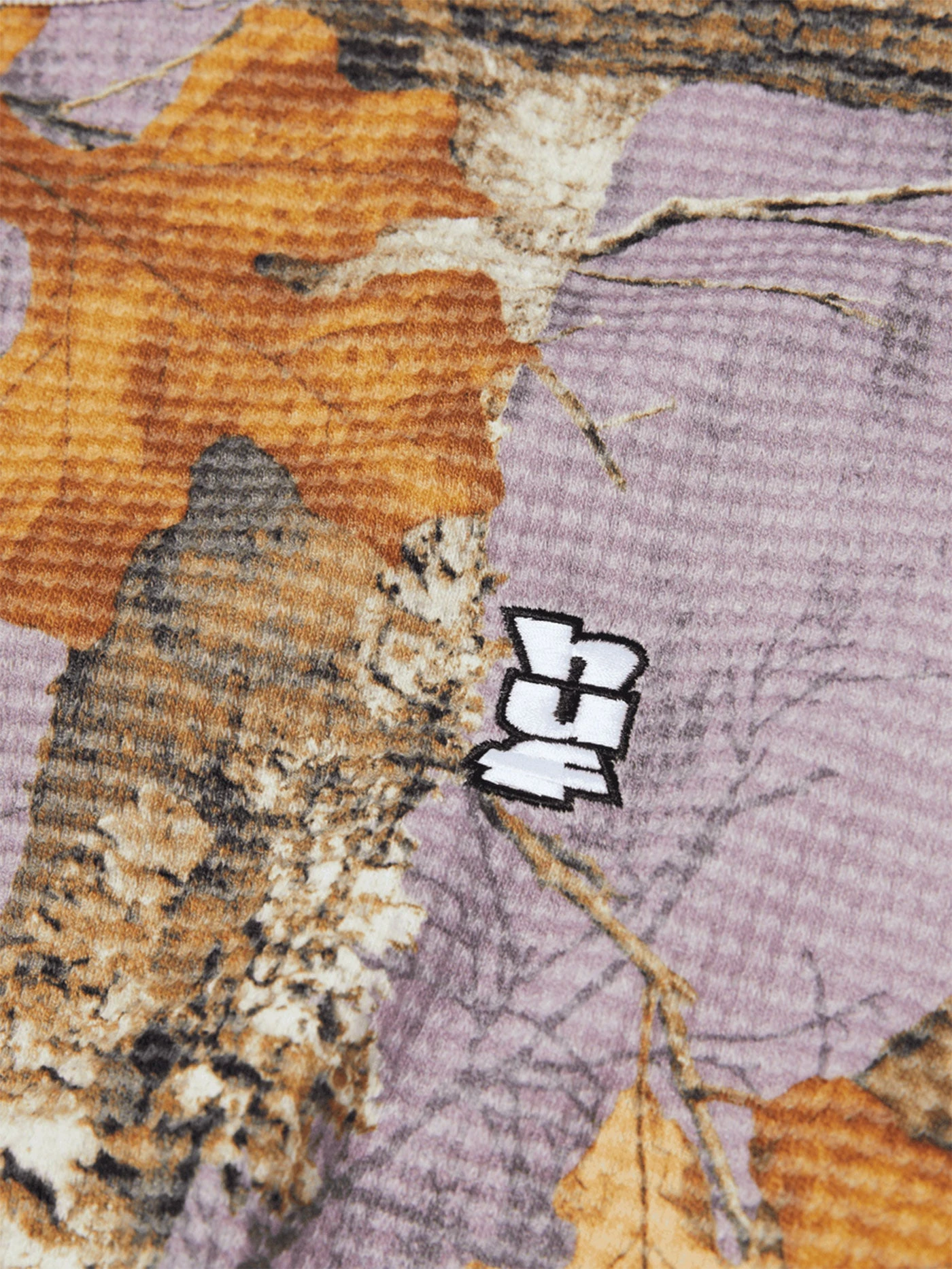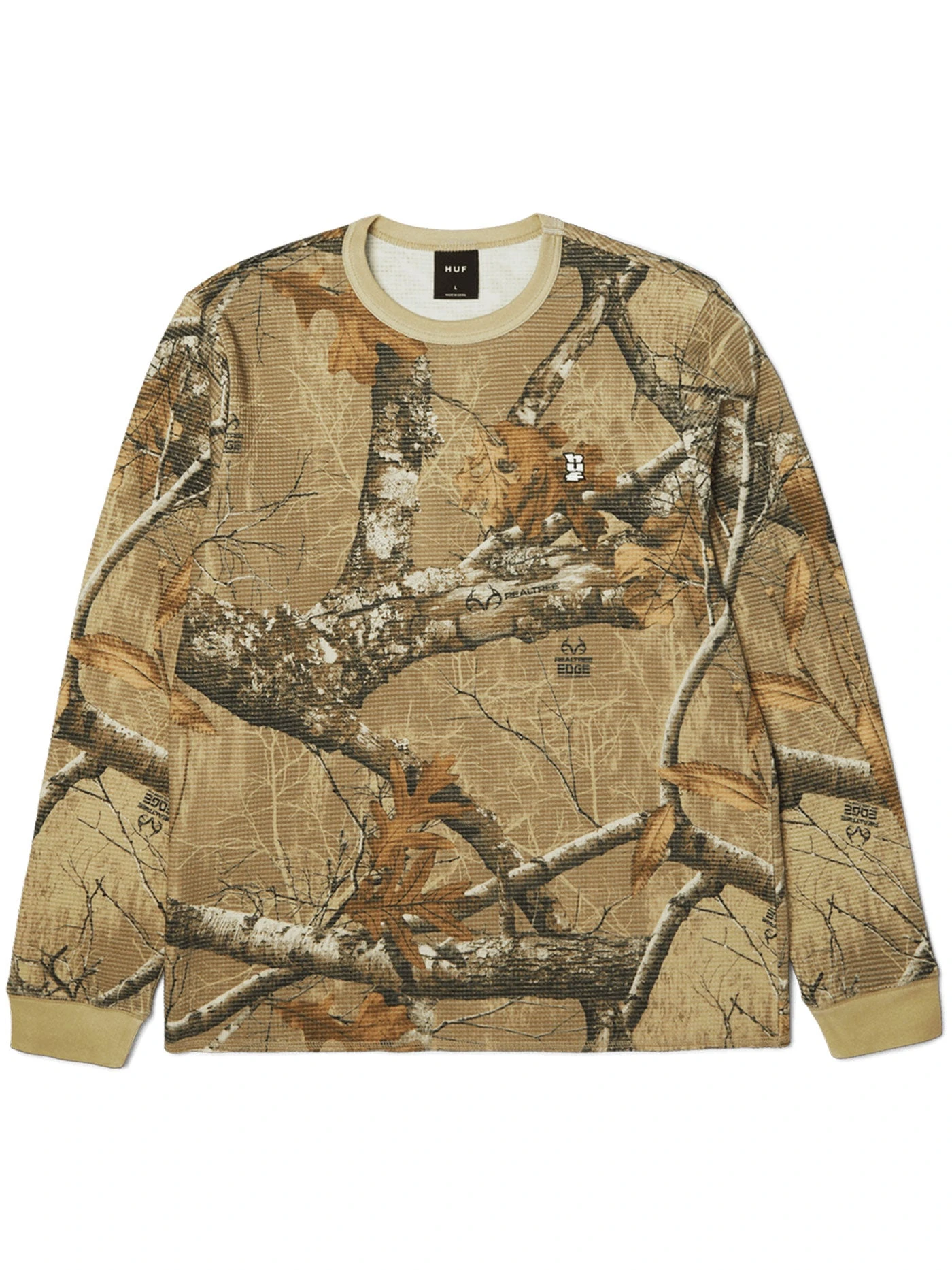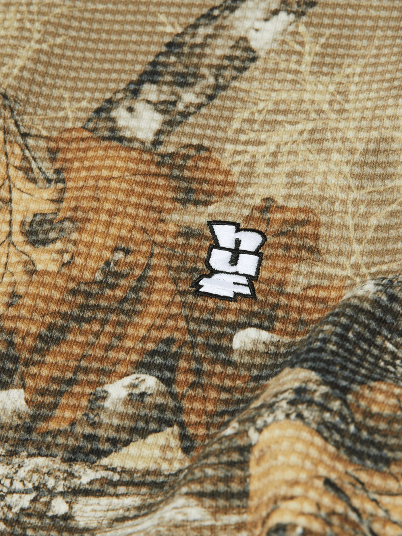 The The HUF x Realtree® Megablast Thermal Top features full coverage Xtra Colors Camo in two colorways, each with a Megablast embroidered chest logo and raw bottom hem.