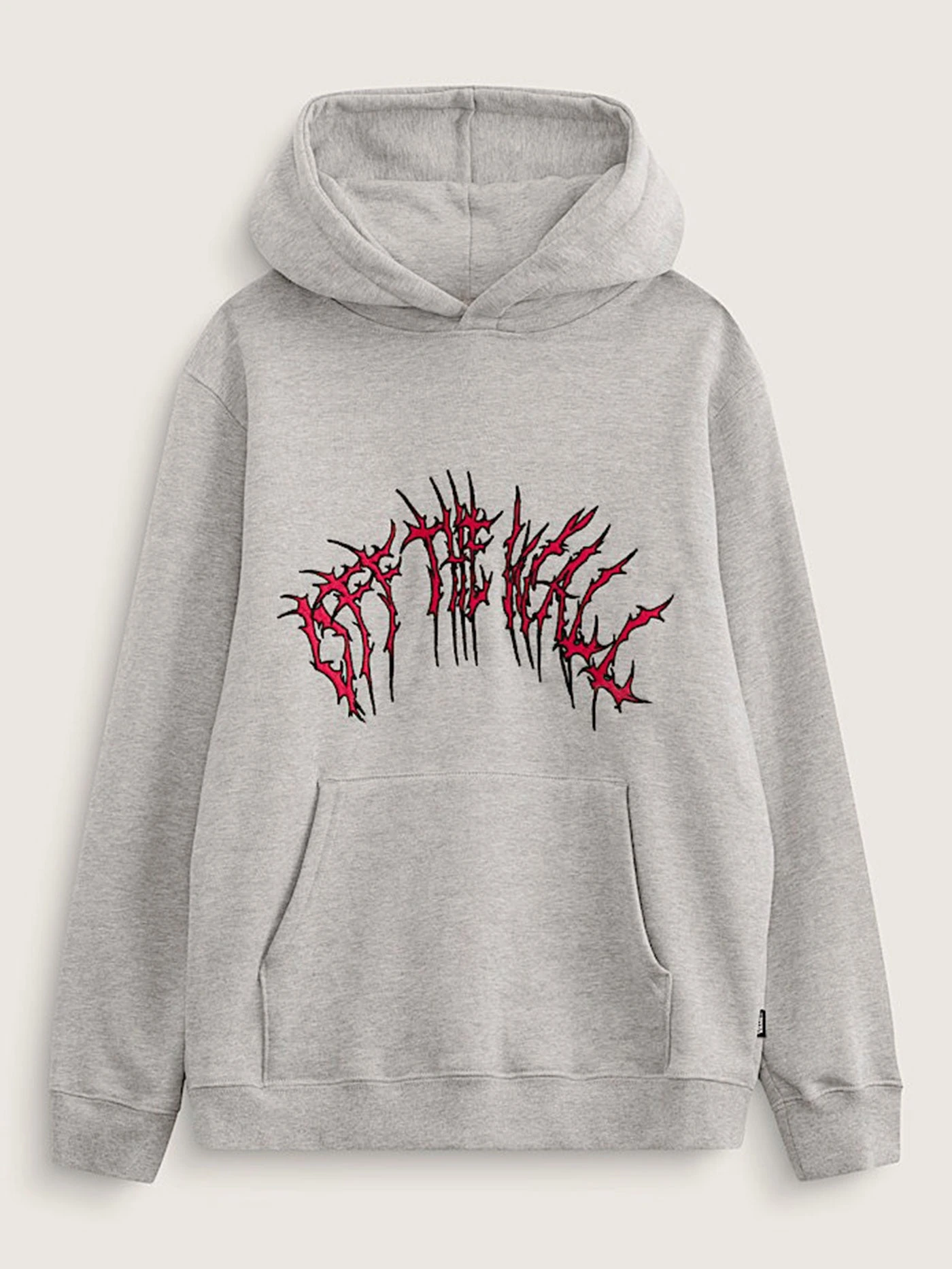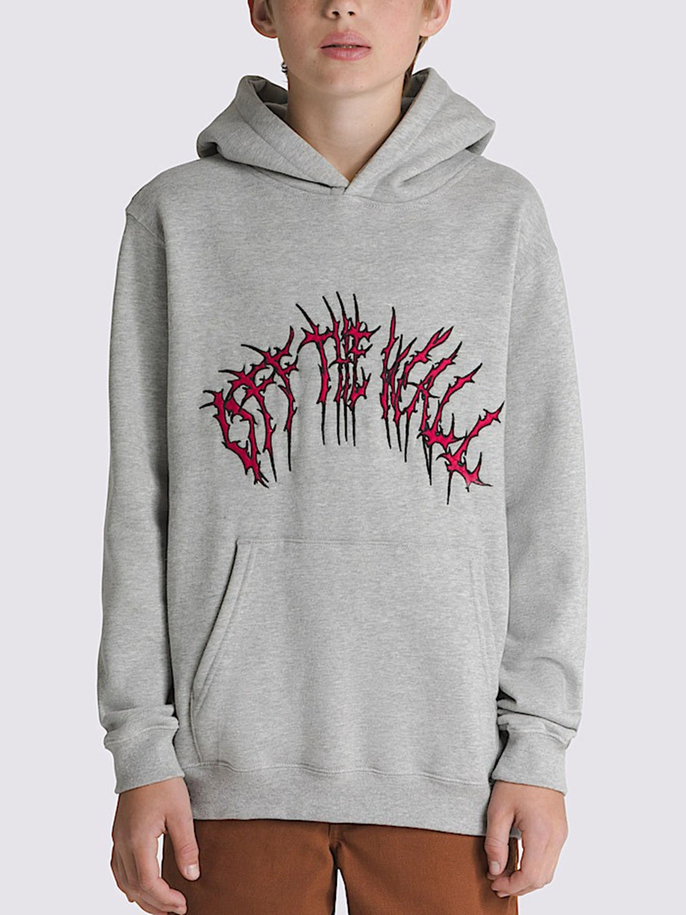 The Kids Metal Arch Pullover Hoodie is a classic pullover hoodie made of cozy midweight brushed back fleece. It features a kangaroo pocket, ribbed details, and a large direct embroidered spiky ”Off the Wall” logo at the chest.