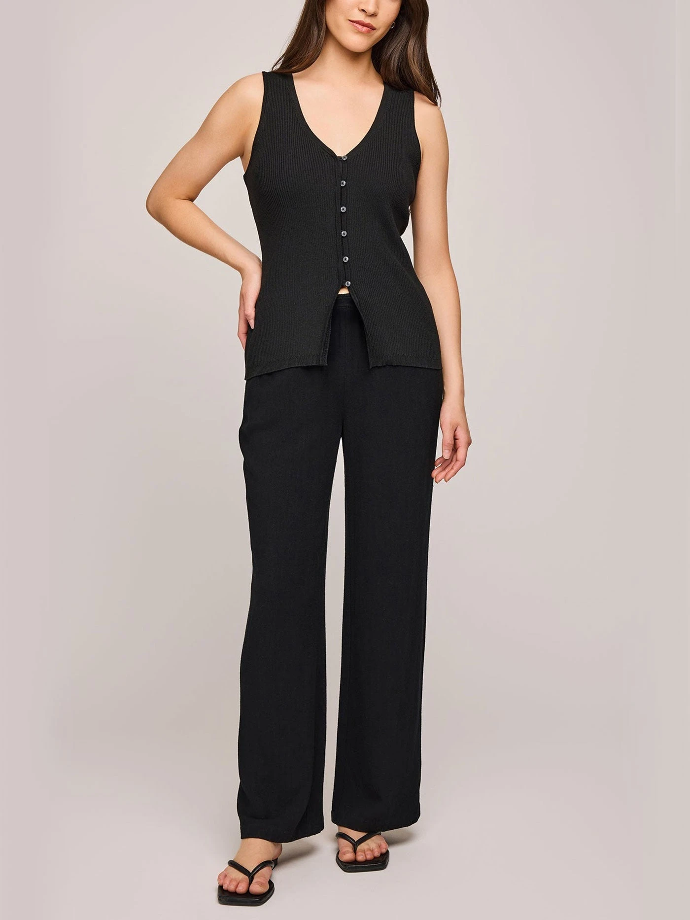 The Miles tank is made of a soft yarn in a rib knit pattern. Features include a v-neckline and functional summary closure.