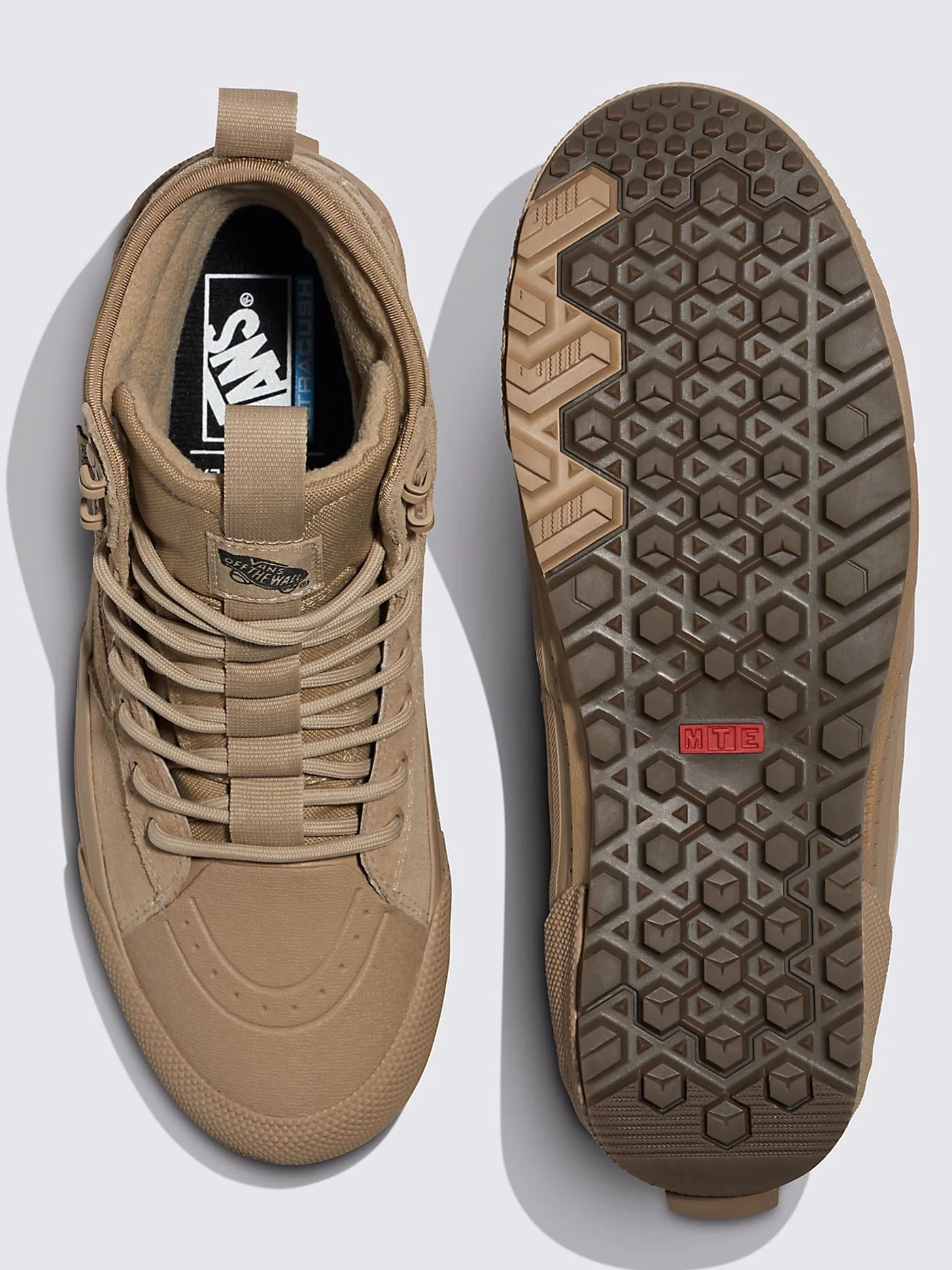 The MTE Sk8-Hi GORE-TEX is all-terrain ready and designed to offer maximum protection from the elements. Built with Vans’ most technically advanced and purpose-built all-weather technology—including GORE-TEX breathable waterproofing to keep you dry, a heat retaining Duratherm insulation package to keep you warm, and an All-Trac rubber outsole to keep you on your feet—this uncompromising Sk8-Hi upgrade delivers our most progressive cold weather promises so that nothing stands between you and your next adventure. It is made with leather, textile, and synthetic uppers.