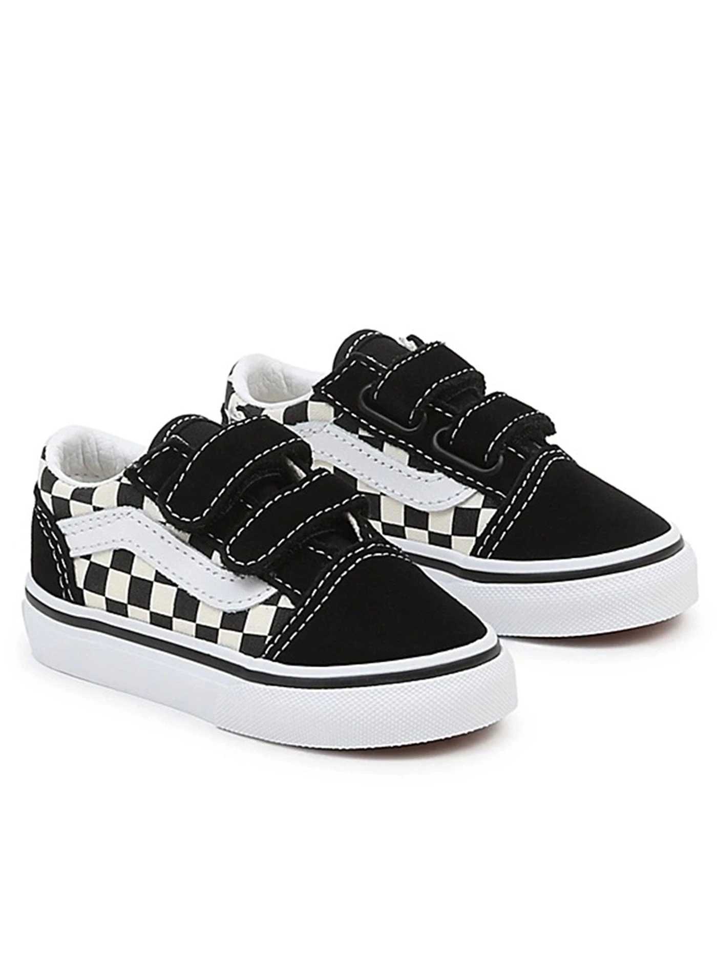 The Primary Check Old Skool V, inspired by the Vans classic skate shoe, features a low profile silhouette with sturdy checkerboard-printed canvas and suede uppers, hook-and-loop closures, padded collars for support and flexibility, and signature rubber waffle outsoles.