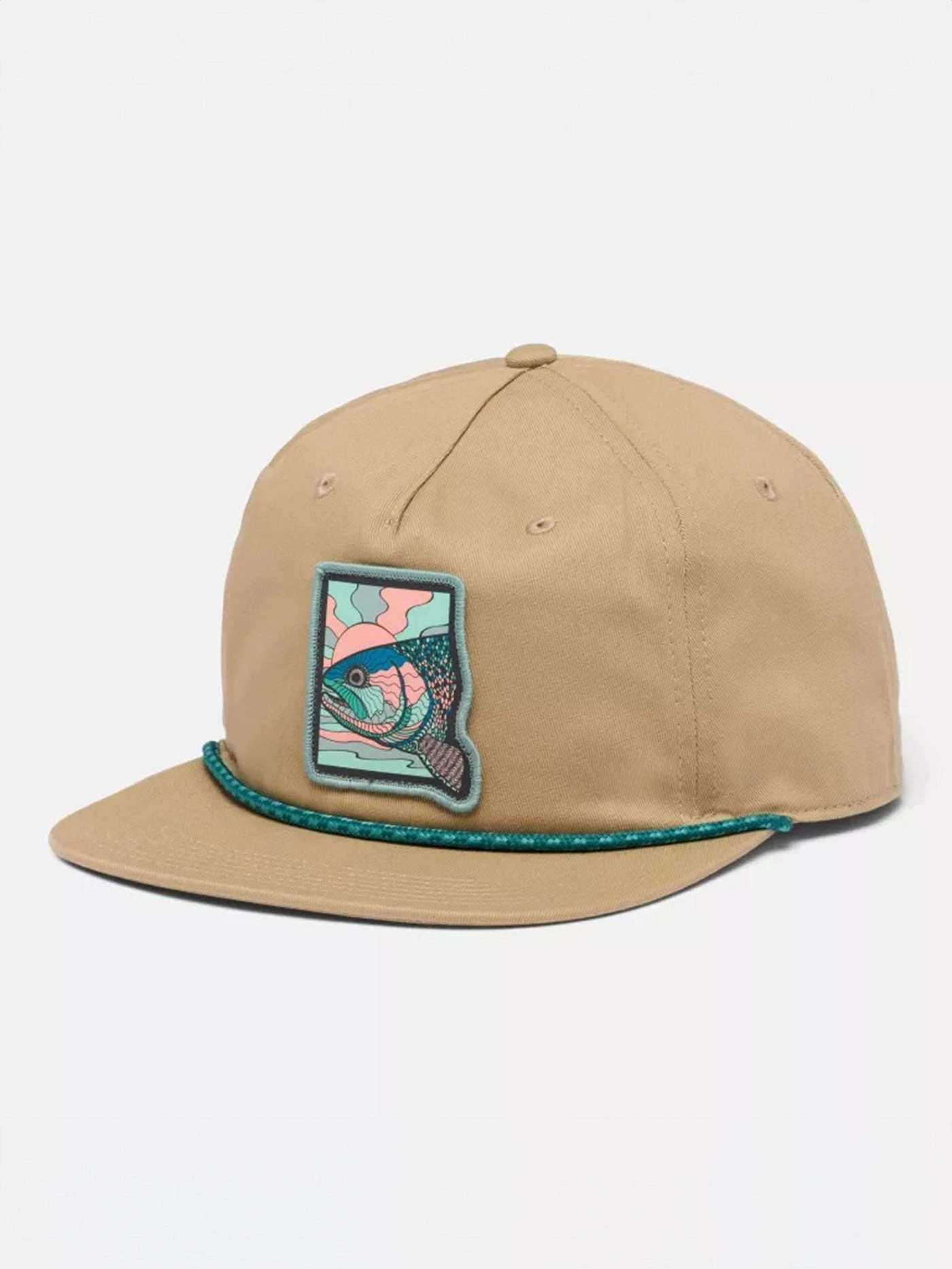Cette casquette snapback à cinq panneaux d’inspiration vintage est conçue pour les pêcheurs et les aventuriers.