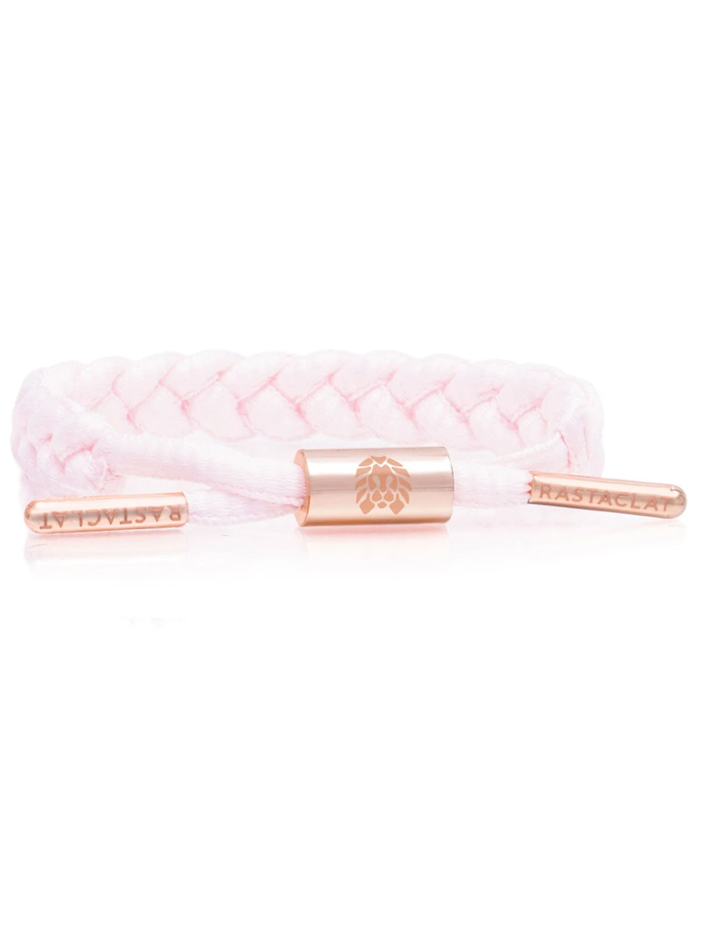 LIGHT PINK WOMEN’S BRAIDED BRACELET FEATURING ELECTROPLATED PEACH GOLD HARDWARE AND LASER ETCHED EMBLEMS.