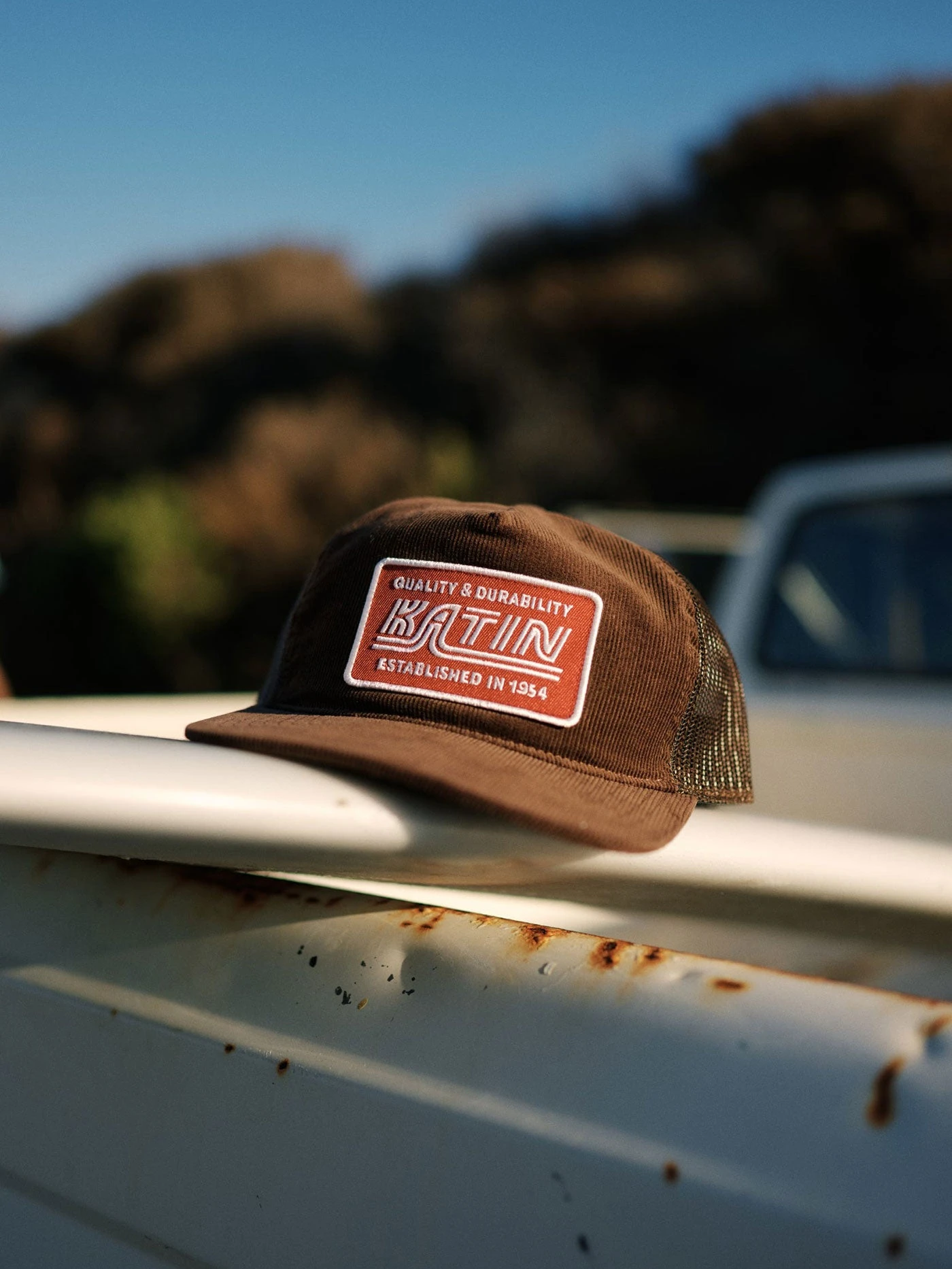 The Pit Stop Trucker Hat features a custom patch reminiscent of license plates in Hawaii, the hat is made from cotton canvas with a polyester mesh back and snapback closure.