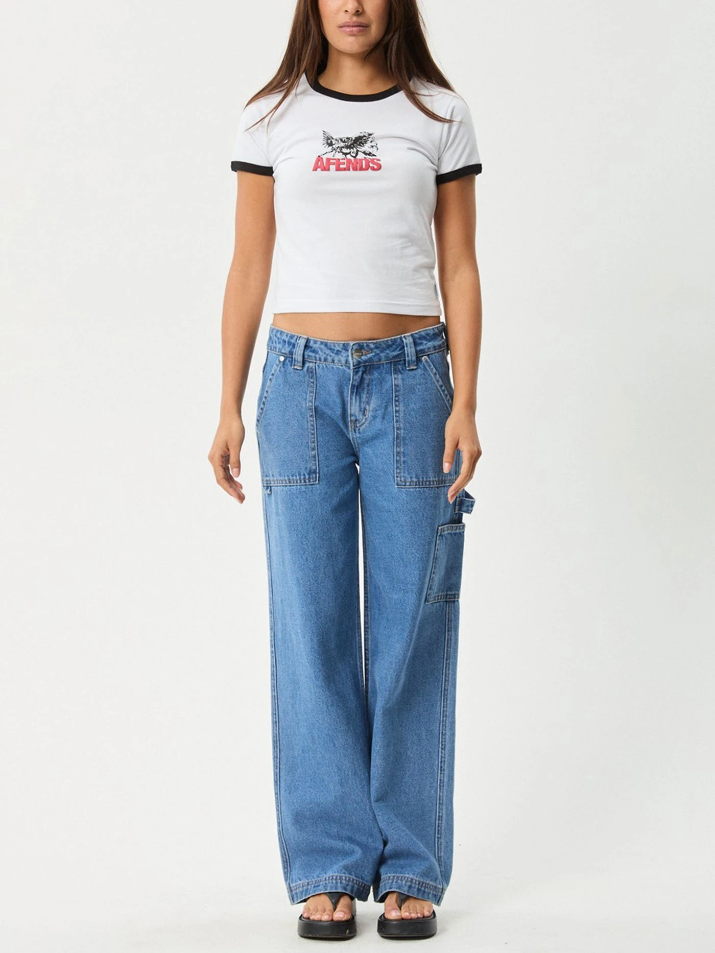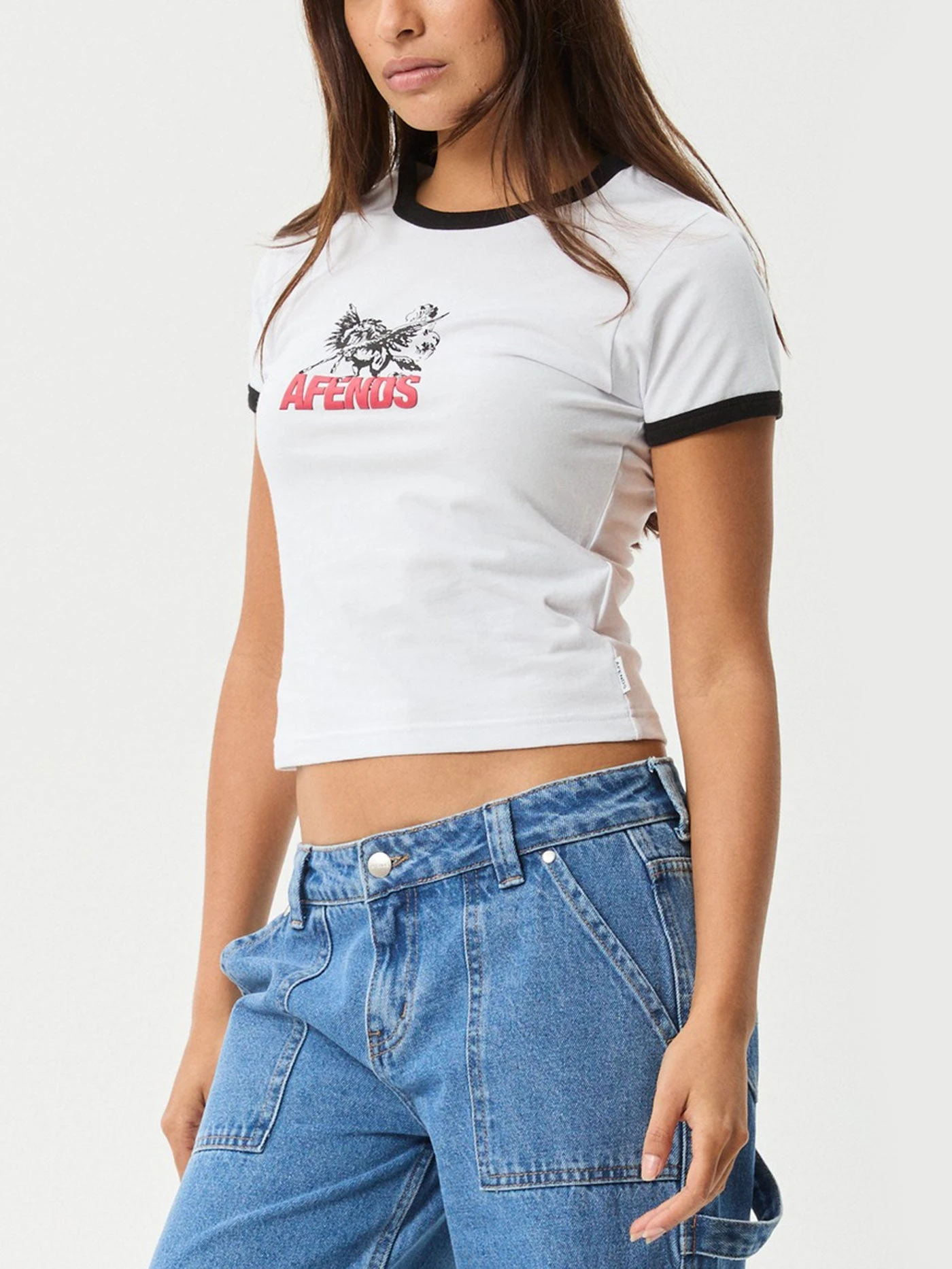 The ‘Pony Up’ ringer tee offers a slim fit and cropped length with a 70’s vintage-inspired style. The ribbed contrast neck and sleeves add a retro touch, and it’s crafted from a recycled cotton blend jersey.
