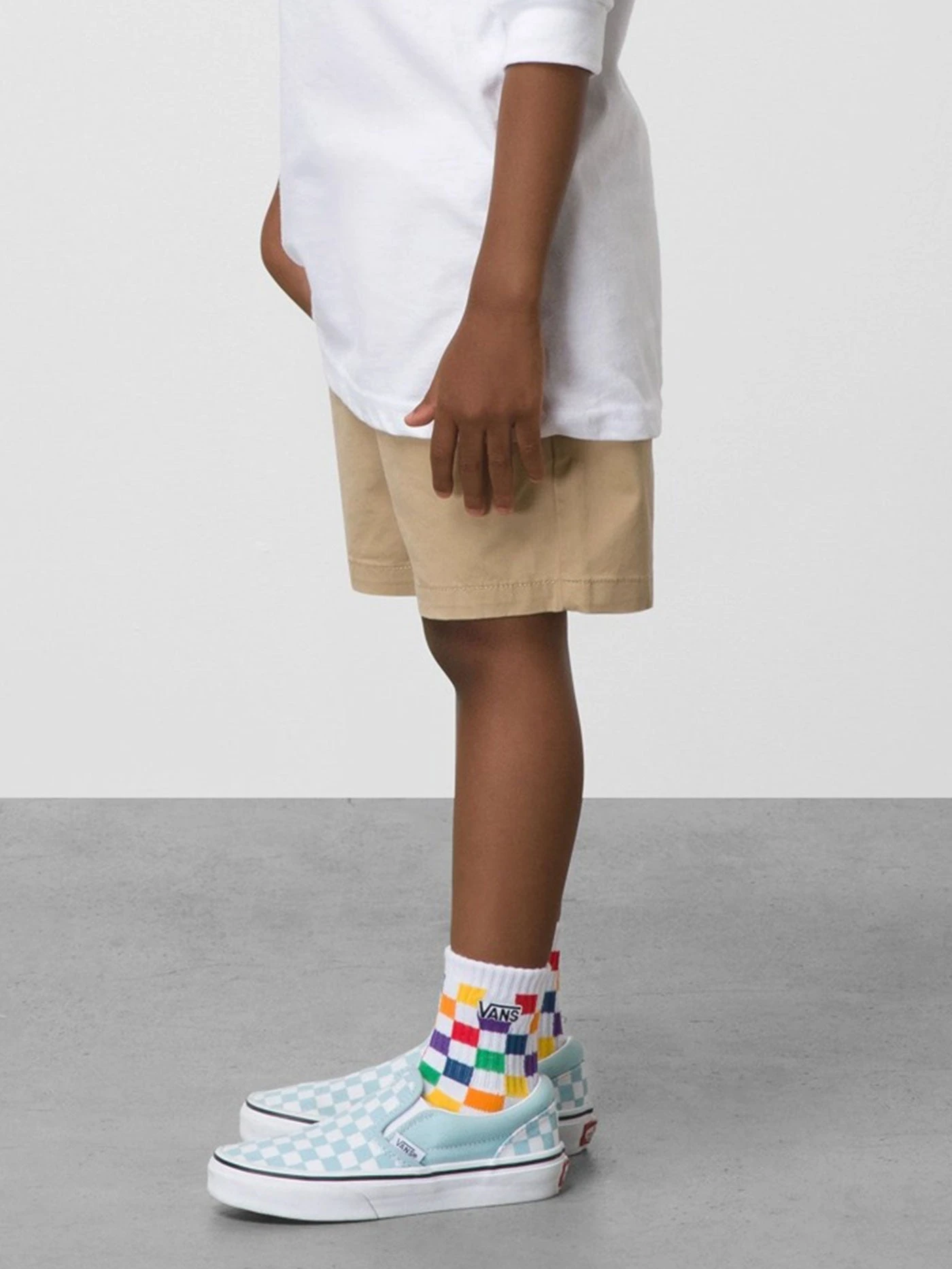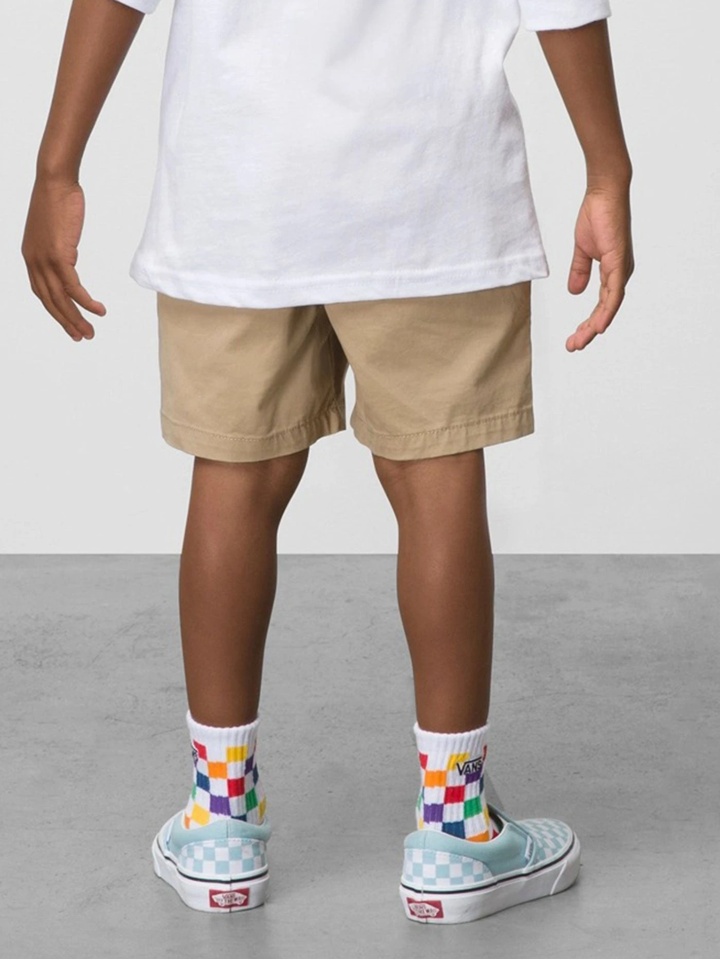 The Kids Range Elastic Waist Short is a 98% cotton, 2% elastane lightweight twill chino short with an elastic waistband, drawcord, and slit pockets.