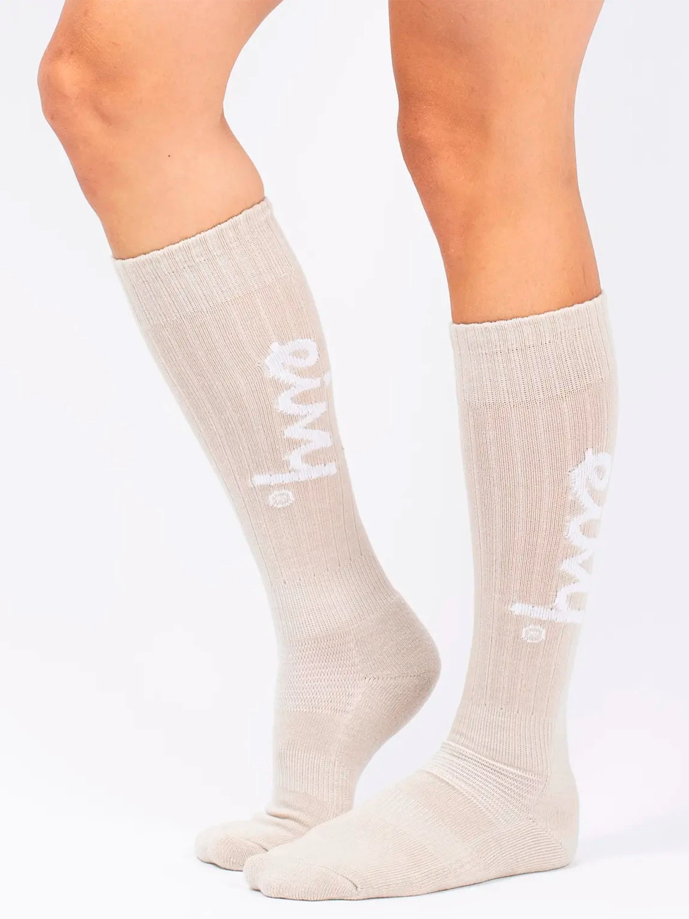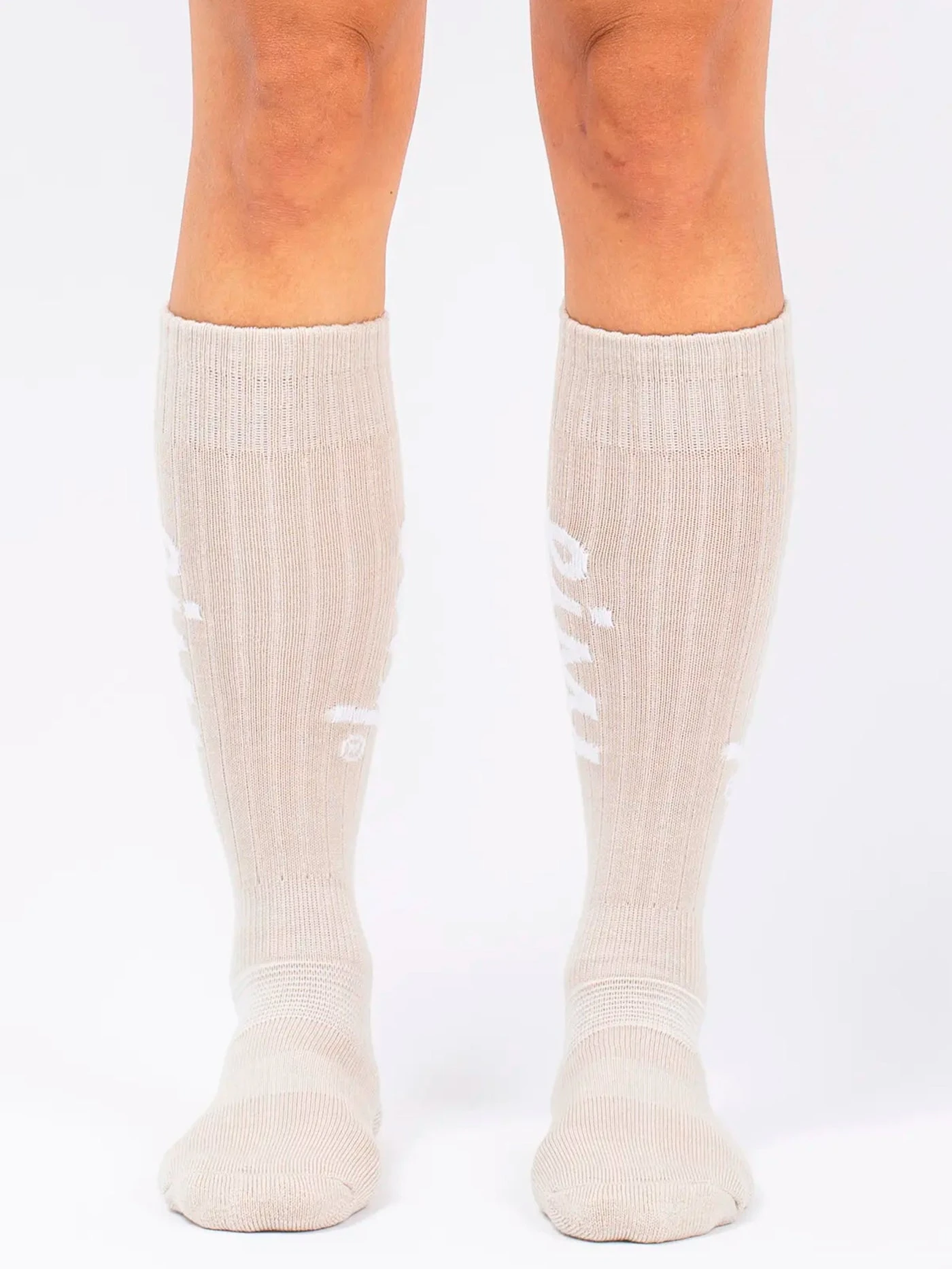 Ribbed beige sock perfect whether you are on skis or snowboard. The design is loaded with tech to stop you from freezing in any condition, the Rib Wool socks can go from the mountain to the club and back. Padded footbed and toe pocket, ankle flex zone and ribbed grip zones. Woven patch detailing and merino wool blend for warmth and durability.