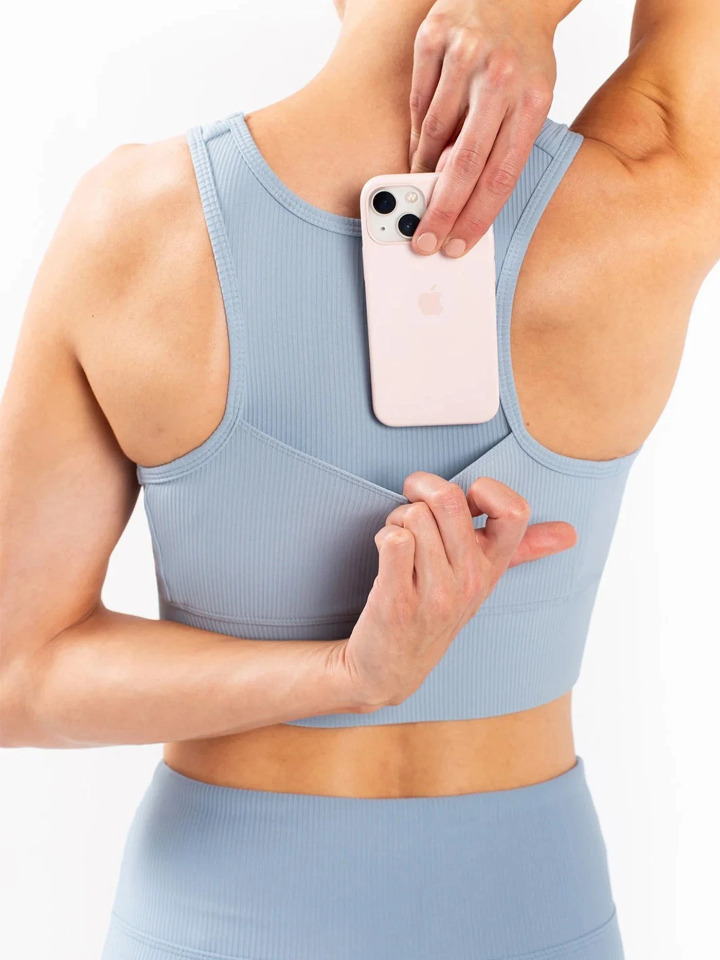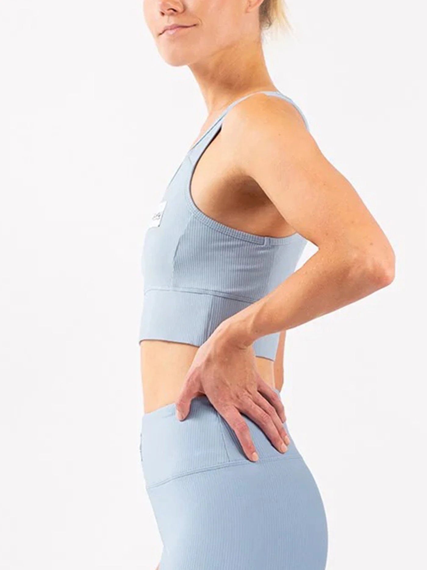 Mountain to the sea where I wanna be – multiFUNctional light blue sports bra cut for yoga, surfing, snowboarding, skiing and all good things in between. The flatlock seams prevent chafing and the elastic chest band makes it a comfortable fit. The bra is also equipped with a removable fleece lining for extra warmth and support and an integrated pocket at the back.