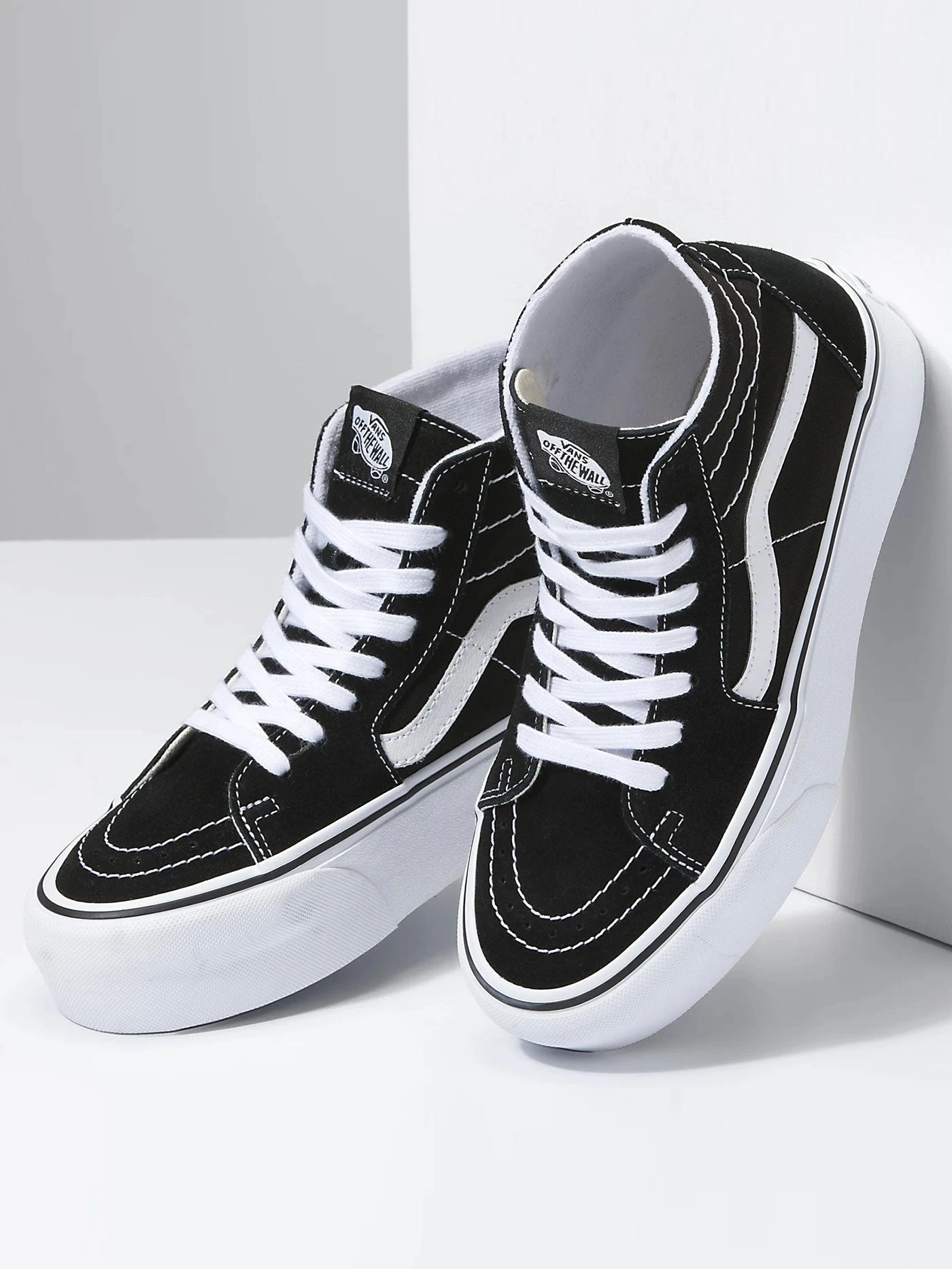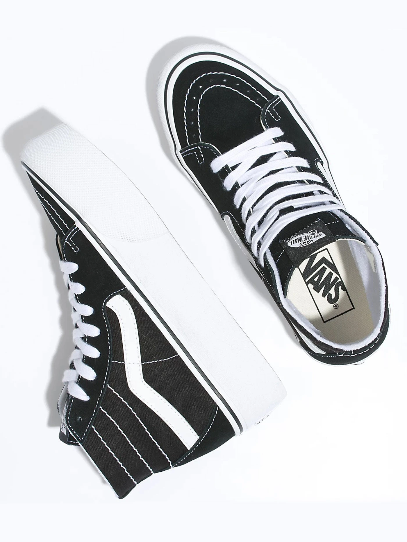 The Sk8-Hi Tapered Stackform refreshes our deconstructed high top silhouette with an even chunkier take on the platform aesthetic. Constructed with a 34 mm sidewall height, this platform shoe elevates a legendary favorite while bringing a new “Off The Wall” style to your look. Along with traditional suede and canvas uppers, the Sk8-Hi Tapered Stackform features a more slender and fitted silhouette than the traditional Sk8-Hi. It is finished with signature rubber waffle outsoles.