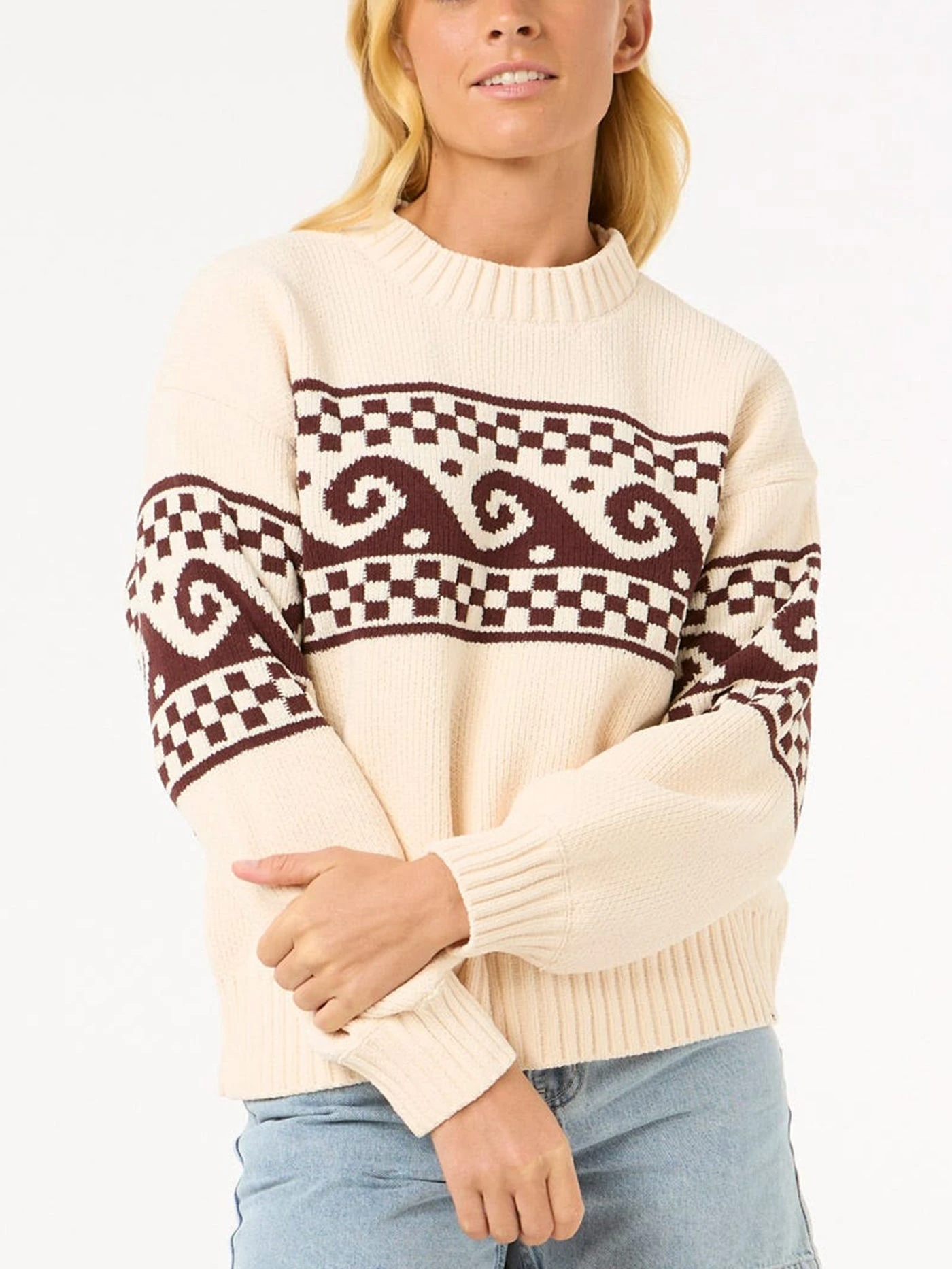 The Soleil Knit Crew offers oversized coziness with a soft hand feel, 2-color knit design, and logo clamp. Perfect for laid-back, chilly mornings.