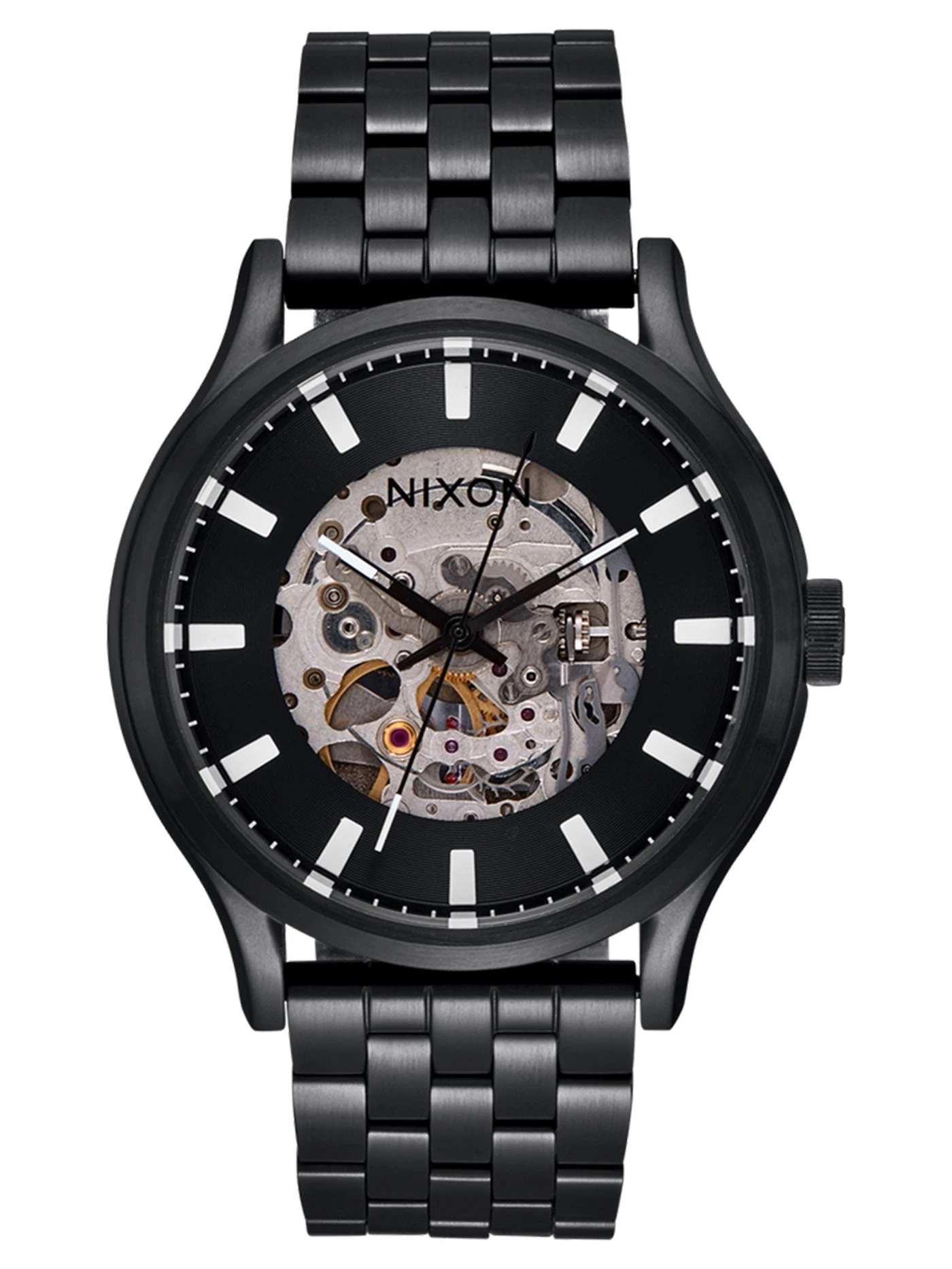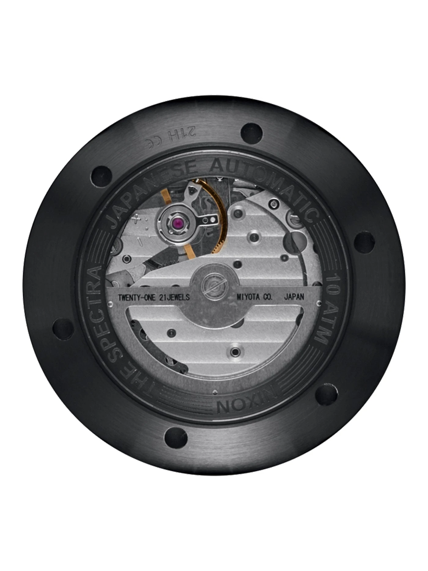 The Spectra sits exquisitely between defying tradition and paying homage to the classic art of watchmaking. Its twenty-one jewel automatic movement is fully displayed through the spectacular transparent skeleton face, punctuated by striking indices and the Nixon wordmark that appears to float above it all. It’s daring, dimensional, and drops jaws anywhere it goes.
